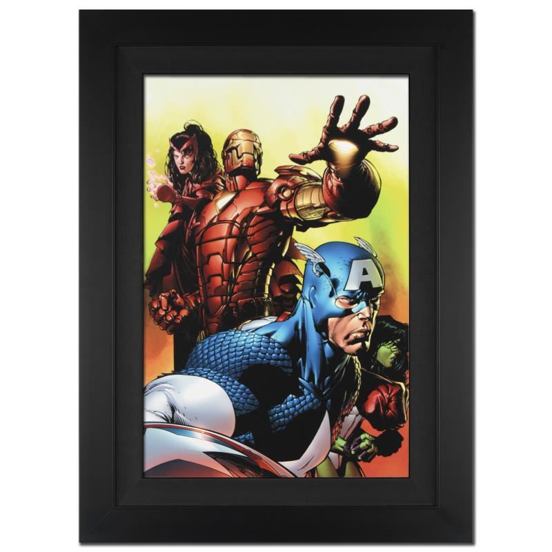 A piece of comic book history, this limited edition, from original art by David Finch, depicts the heroic Scarlet Witch, Captain America, Iron Man, and She-Hulk. In 2003, Finch came to Marvel Comics for a year-long arc on Ultimate X-Men, after which he began work on The Avengers and thereafter The New Avengers. He has also worked on such titles as Captain America, Spider-Man and the Hulk. "Avengers #501" is an extremely limited edition giclee on canvas by David Finch presented by Marvel Comics, hand signed by the great Stan Lee and numbered out of only 4! Includes Certificate of Authenticity! This piece comes custom framed and ready to hang. Includes Certificate of Authenticity! Measures approx. 29" x 40" (with frame); 22" x 33" (image).