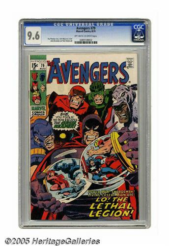 <B>Avengers #79 (Marvel, 1970) CGC NM+ 9.6 Off-white to white pages.</B></I> The Avengers' battle with the Lethal Legion continues. John Buscema cover. Buscema and Tom Palmer art. Overstreet 2005 NM- 9.2 value = $42. CGC census 3/05: 14 in 9.6, 1 higher.