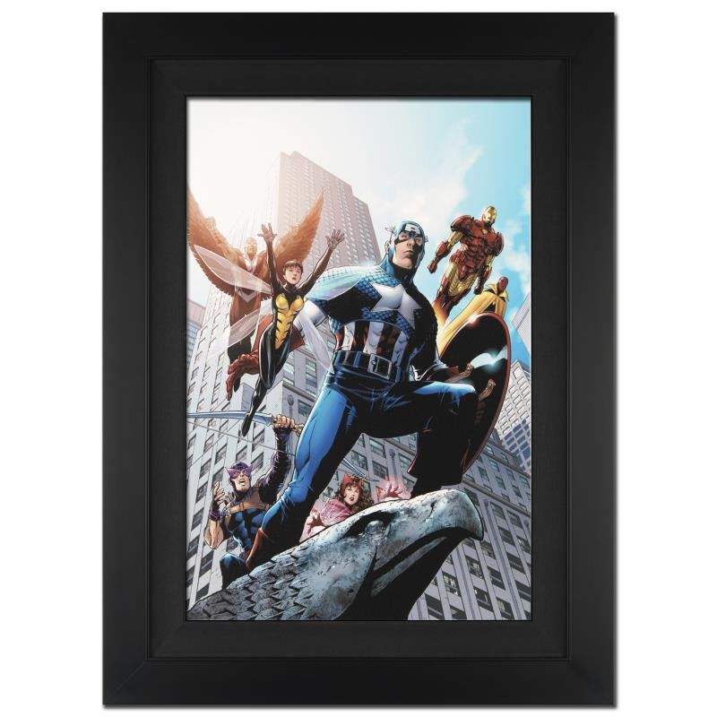 A piece of comic book history, this limited edition, from original art by Scott Kolins, depicts the heroic Avengers. Kolins' interest in drawing and comics began when he was around 10 years old as an avid comic book reader in the late 1970s. In 1991 he went to New Jersey to The Kubert School which he attended for two years before getting a job with Valiant Comics. He was then hired as a Romita Raider (in house art corrections under John Romita Sr.) at Marvel Comics. "Avengers #82" is an extremely limited edition giclee on canvas by Scott Kolins presented by Marvel Comics, hand signed by the great Stan Lee and numbered out of only 10! This piece comes custom framed and ready to hang. Includes Certificate of Authenticity! Measures approx. 25" x 34" (with frame); 18" x 27" (image).