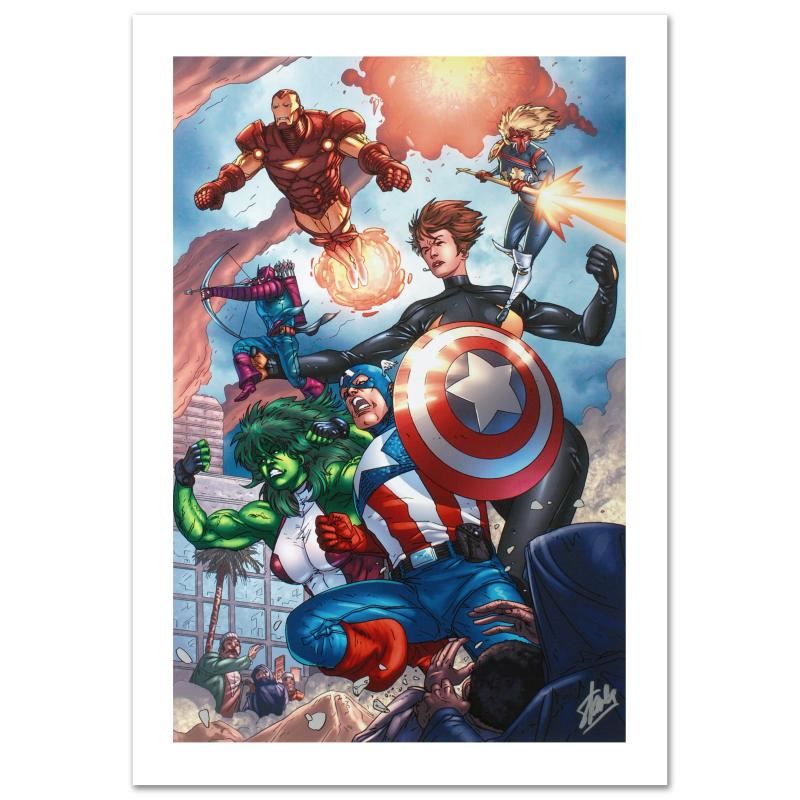 A piece of comic book history, this limited edition, from original art by Scott Kolins, depicts Lionheart, Hawkeye, Iron Man, Captain America, She-Hulk and Wasp. Kolins' interest in drawing and comics began when he was around 10 years old as an avid comic book reader in the late 1970s. In 1991 he went to New Jersey to The Kubert School where he attended 2 years and then got a job with Valiant Comics. He was then hired as a Romita Raider (in house art corrections under John Romita Sr.) at Marvel Comics. "Avengers #84" is a limited edition giclee on canvas by Scott Kolins presented by Marvel Comics, numbered and hand signed by the Great Stan Lee (1922-2018)! Includes Certificate of Authenticity! Measures approx. 18" x 27" (image).