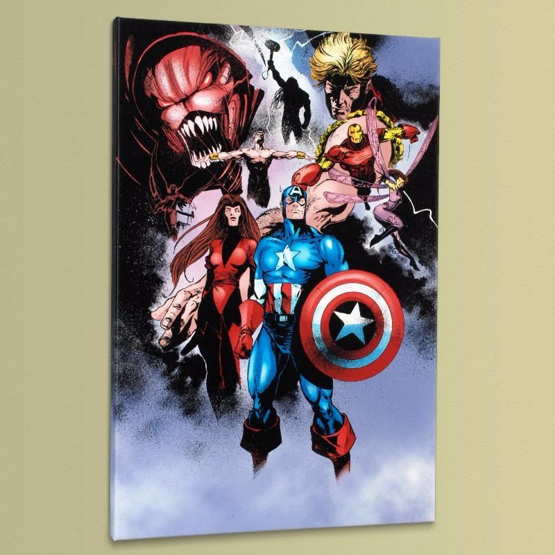 A piece of comic book history, this limited edition, from original art by Leonardo Manco, depicts Marvel characters such as Captain America, Iron Man, and Wasp. An Argentinian artist, Leonardo Manco is best known for his dark and gritty style on such titles as Hellstorm, Blaze of Glory, Apache Skies, Deathlok Vol.3 and Hellblazer. Manco Has also worked on such Marvel titles as War Machine and Druid. "Avengers #99 Annual" is a limited edition numbered giclee on stretched canvas by Leonardo Manco presented by Marvel Comics. This piece comes gallery wrapped and ready to hang. Includes Certificate of Authenticity! Measures approx. 18" x 27" (image); 1.5" (depth). Retail Price $500.00. PRICE INCUDES FREE SHIPPING IN THE U.S. - SHIPPING WILL BE ADDED TO YOUR INVOICE FOR ALL BUYERS OUTSIDE OF THE U.S.