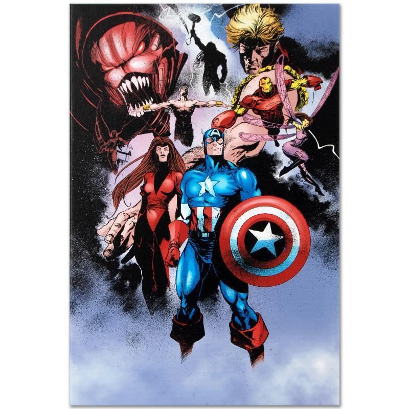 A piece of comic book history, this limited edition, from original art by Leonardo Manco, depicts Marvel characters such as Captain America, Iron Man, and Wasp. An Argentinian artist, Leonardo Manco is best known for his dark and gritty style on such titles as Hellstorm, Blaze of Glory, Apache Skies, Deathlok Vol.3 and Hellblazer. Manco Has also worked on such Marvel titles as War Machine and Druid. "Avengers #99 Annual" is a limited edition numbered giclee on stretched canvas by Leonardo Manco presented by Marvel Comics. This piece comes gallery wrapped. Includes Certificate of Authenticity! Measures approx. 18" x 27" (image); 1.5" (depth).