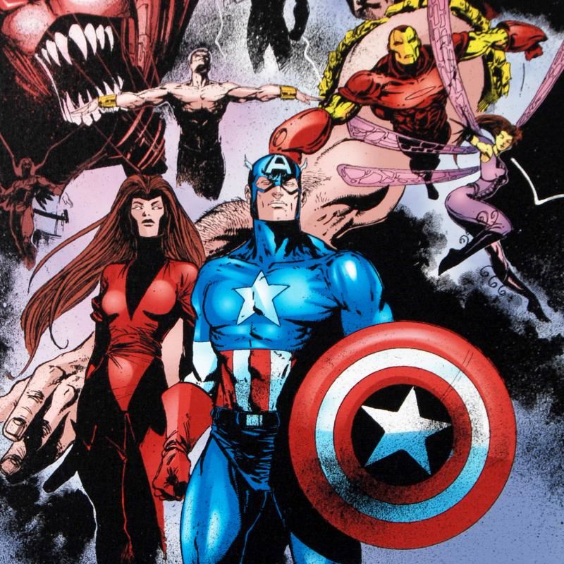 A piece of comic book history, this limited edition, from original art by Leonardo Manco, depicts Marvel characters such as Captain America, Iron Man, and Wasp. An Argentinian artist, Leonardo Manco is best known for his dark and gritty style on such titles as Hellstorm, Blaze of Glory, Apache Skies, Deathlok Vol.3 and Hellblazer. Manco Has also worked on such Marvel titles as War Machine and Druid. "Avengers #99 Annual" is a limited edition numbered giclee on stretched canvas by Leonardo Manco presented by Marvel Comics. This piece comes gallery wrapped. Includes Certificate of Authenticity! Measures approx. 18" x 27" (image); 1.5" (depth).