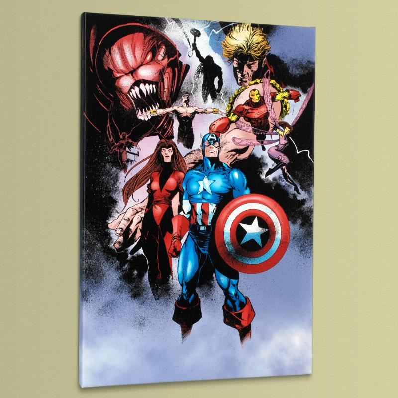 A piece of comic book history, this limited edition, from original art by Leonardo Manco, depicts Marvel characters such as Captain America, Iron Man, and Wasp. An Argentinian artist, Leonardo Manco is best known for his dark and gritty style on such titles as Hellstorm, Blaze of Glory, Apache Skies, Deathlok Vol.3 and Hellblazer. Manco Has also worked on such Marvel titles as War Machine and Druid. "Avengers #99 Annual" is a limited edition numbered giclee on stretched canvas by Leonardo Manco presented by Marvel Comics. This piece comes gallery wrapped. Includes Certificate of Authenticity! Measures approx. 18" x 27" (image); 1.5" (depth).