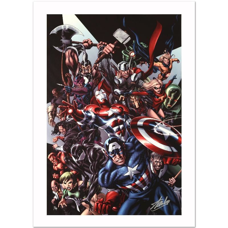 A piece of comic book history, this limited edition, from original art by Mike McKone, depicts several classic characters from the Marvel Universe. Michael "Mike" McKone is a British comic book artist. McKone's first published works for the major companies included DC Comics' Justice League of America and Justice League International and The Punisher War Zone for Marvel Comics. However, it was his work on Marvel's Exiles which brought him instant attention. McKone is currently penciling Avengers Academy for Marvel Comics. "Avengers Assemble #1" is a limited edition giclee on canvas by Mike McKone presented by Marvel Comics, numbered and hand signed by the great Stan Lee! Includes Certificate of Authenticity! Measures approx. 18" x 27" (image).