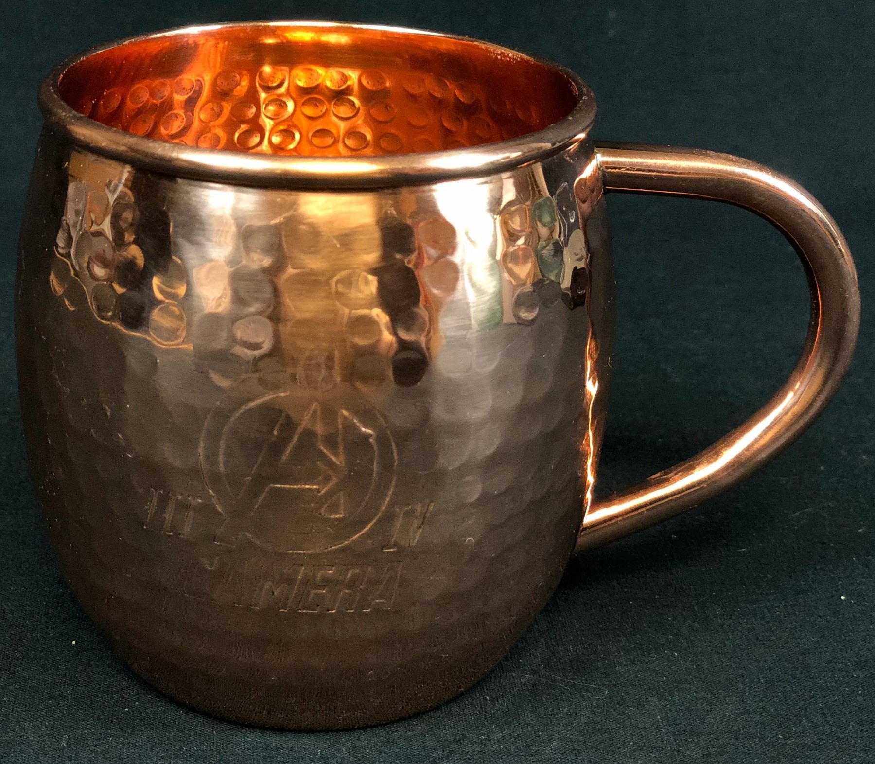 Original copper mug given to the Moscow camera crew. From the superhero films Avengers: Infinity War (2018) & Avengers: Endgame (2019) featuring an ensemble cast including Robert Downey Jr., Chris Evans, Mark Ruffalo, Chris Hemsworth, Scarlett Johansson, Jeremy Renner, Don Cheadle, Paul Rudd, Brie Larson, Karen Gillan, Danai Gurira, Benedict Wong, Jon Favreau, Bradley Cooper, Gwyneth Paltrow, and Josh Brolin.
