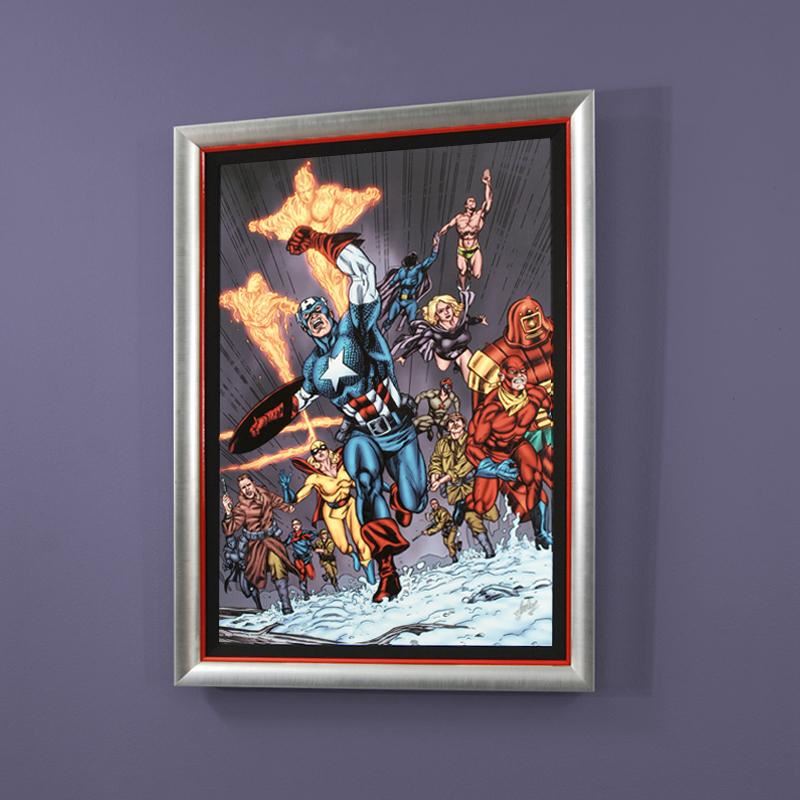 A piece of comic book history, this limited edition, from original art by Steve Sadowski, depicts the classic characters Captain America, The Human Torch, and Black Widow, among others. Obsessed with comic from an early age, Steve Sadowski now does the artwork for the Avengers/Invader series. "Avengers/Invader #11" is an extremely limited edition giclee on canvas by Steve Sadowski presented by Marvel Comics, hand signed by the Great Stan Lee (1922-2018) and numbered out of only 10! This piece comes custom framed and ready to hang. Includes Certificate of Authenticity! Measures approx. 25" x 34" (with frame), 18" x 27" (image).