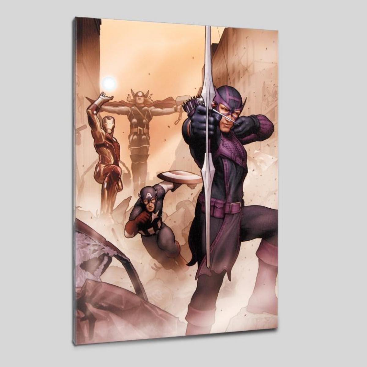 A piece of comic book history, this limited edition, from original art by John Tyler Christopher, features Hawkeye with Captain America, Iron Man, and Thor. A cover artist for Marvel, John Tyler Christopher has working on the Avengers and X-men franchises, among others. "Avengers: Solo #1" is a limited edition numbered giclee on stretched canvas by John Tyler Christopher presented by Marvel Comics. This piece comes gallery wrapped. Includes Certificate of Authenticity! Measures approx. 18" x 27" (image); 1.5" (depth).