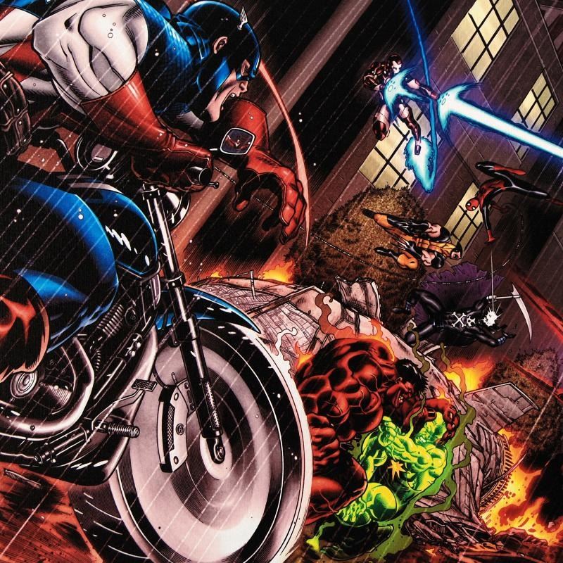 A piece of comic book history, this limited edition, from original art by Ed McGuinness, features the duo of Captain America and his long time friend Bucky. In May 2006, McGuinness signed an exclusive two-year contract with Marvel Comics. His first printed Marvel piece was a cover for the Marvel limited series Civil War. He is best known for his work on the "Red Hulk" series. "Avengers: X-Sanction #1" is a limited edition numbered giclee on canvas by Ed McGuinness presented by Marvel Comics. This piece comes gallery wrapped and ready to hang! Includes Certificate of Authenticity! Measure approx. 24" x 18" (image). Retail Price $500.00. PRICE INCUDES FREE SHIPPING IN THE U.S. - SHIPPING WILL BE ADDED TO YOUR INVOICE FOR ALL BUYERS OUTSIDE OF THE U.S.