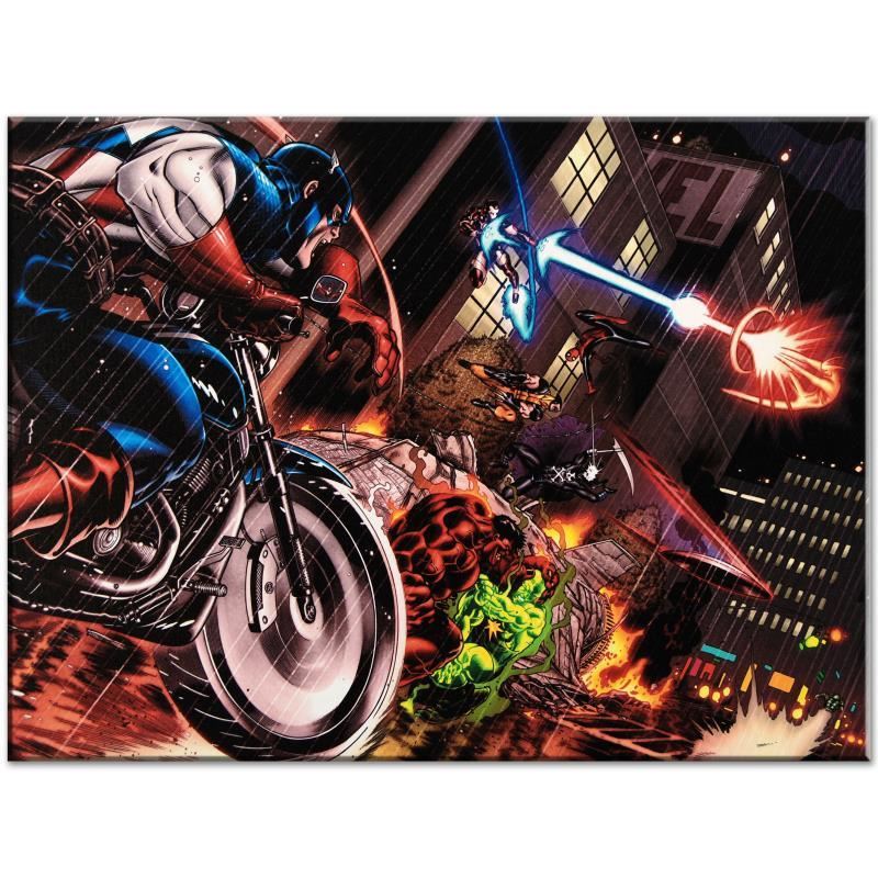 A piece of comic book history, this limited edition, from original art by Ed McGuinness, features the duo of Captain America and his long time friend Bucky. In May 2006, McGuinness entered an exclusive two-year contract with Marvel Comics. His first printed Marvel piece was a cover for the Marvel limited series Civil War. He is best known for his work on the "Red Hulk" series. "Avengers: X-Sanction #1" is a limited edition numbered giclee on canvas by Ed McGuinness presented by Marvel Comics. This piece comes gallery wrapped! Includes Certificate of Authenticity! Measure approx. 24" x 18" (image). This item requires special handling and may have a longer than usual turnaround.