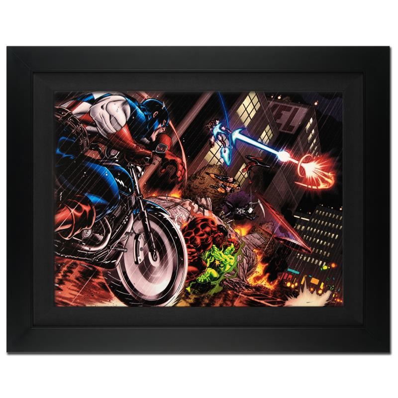 A piece of comic book history, this limited edition, from original art by Ed McGuinness, features the duo of Captain America and his long time friend Bucky. In May 2006, McGuinness signed an exclusive two-year contract with Marvel Comics. His first printed Marvel piece was a cover for the Marvel limited series Civil War. He is best known for his work on the "Red Hulk" series. "Avengers: X-Sanction #1" is an extremely limited edition giclee on canvas by Ed McGuinness presented by Marvel Comics, hand signed by the great Stan Lee and numbered out of only 10! This piece comes custom framed and ready to hang. Includes Certificate of Authenticity! Measures approx. 31" x 25" (with frame); 24" x 18" (image).