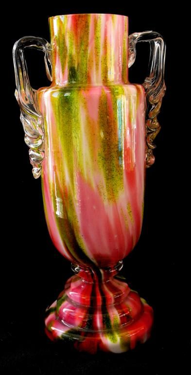 Bohemian glass vase is from Franz Welz and this type of glass found in many colour decors was a commercial export. This is not from Stevens and Williams or is British Cottage Glass that is known as Peacock.Vase is blown of cased glass in a urn / trophy style. Interior is opaque white. Exterior has pink and green aventurine spatter mix.Applied crystal handles are acanthus leaves. The leaf is applied flat to the vase and the stem of the leaf is an open loop to serve as the handle. Entire glass is cased with crystal clear glass.Bottom of flat base has no pontil and the rim is cut. Excellent condition. No visible and distracting chips, hairline breaks or mineral deposit.For accuracy, a (crystal casing) fleabite chip was found by touch on the rim and on the edge of the base. Measures 7-1/4" tall, 1-5/8"diameter rim and the base is 2-5/8" diameter.
