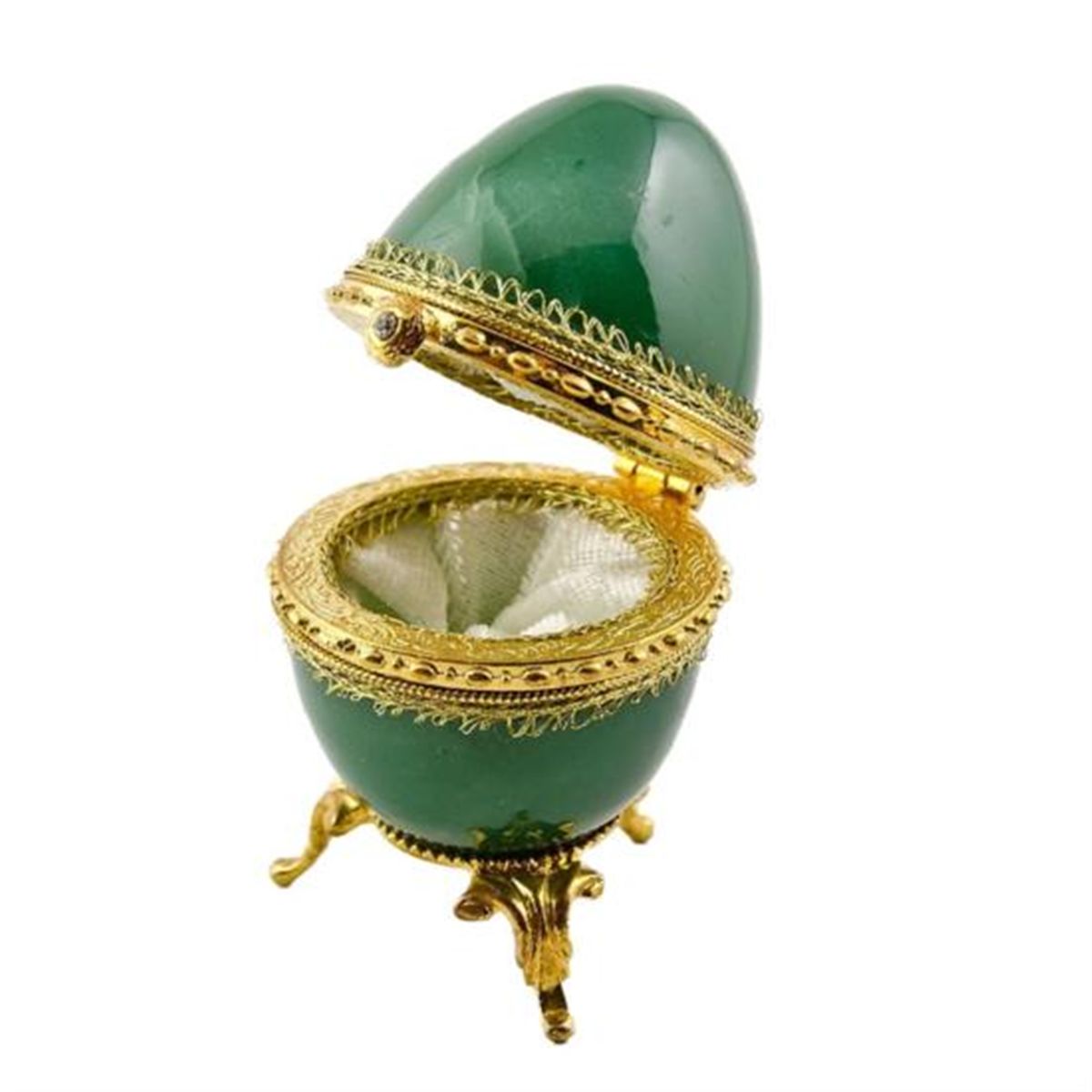 Aventurine Faberge Style Egg, Aventurine is a form of quartz, characterised by its translucency and the presence of platy mineral inclusions that give a shimmering or glistening affect, Approx. Dimensions: 2.75in (H) x 1.75in (D)