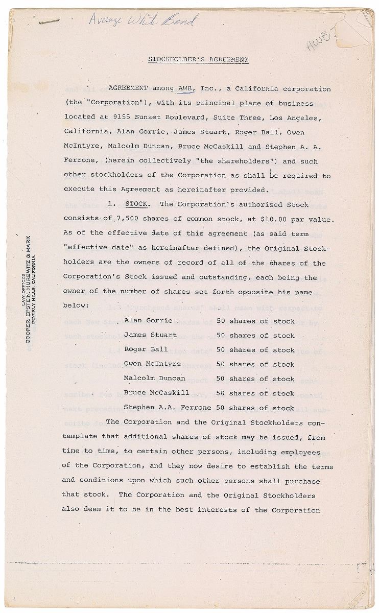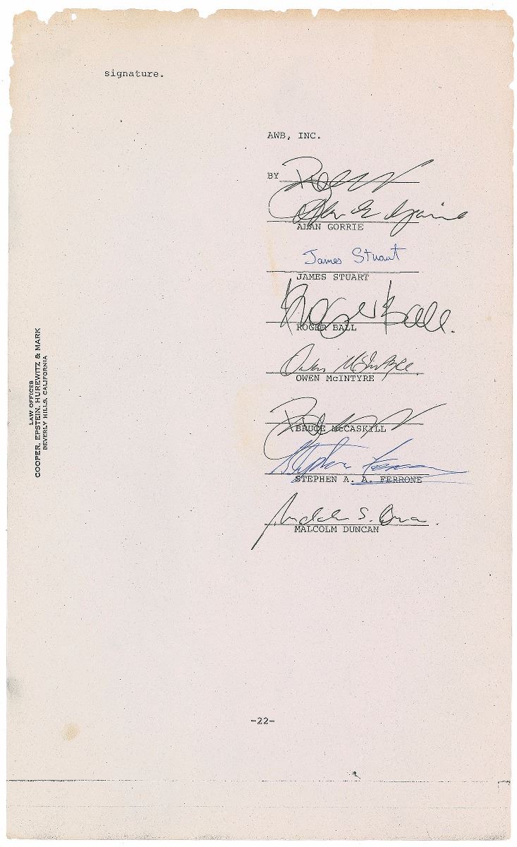 DS, 22 pages, 8.5 x 14, no date but circa 1970s. Stockholder’s agreement setting forth terms with regard to shares of “AWB, Inc.,” naming each member of the band as a shareholder. Signed at the conclusion by Alan Gorrie, James Hamish Stuart, Roger Ball, Owen ‘Onnie’ McIntyre, Bruce McCaskill, Steve Ferrone, and Malcolm ‘Molly’ Duncan. In fine condition, with signed page detached and chipped along top edge.