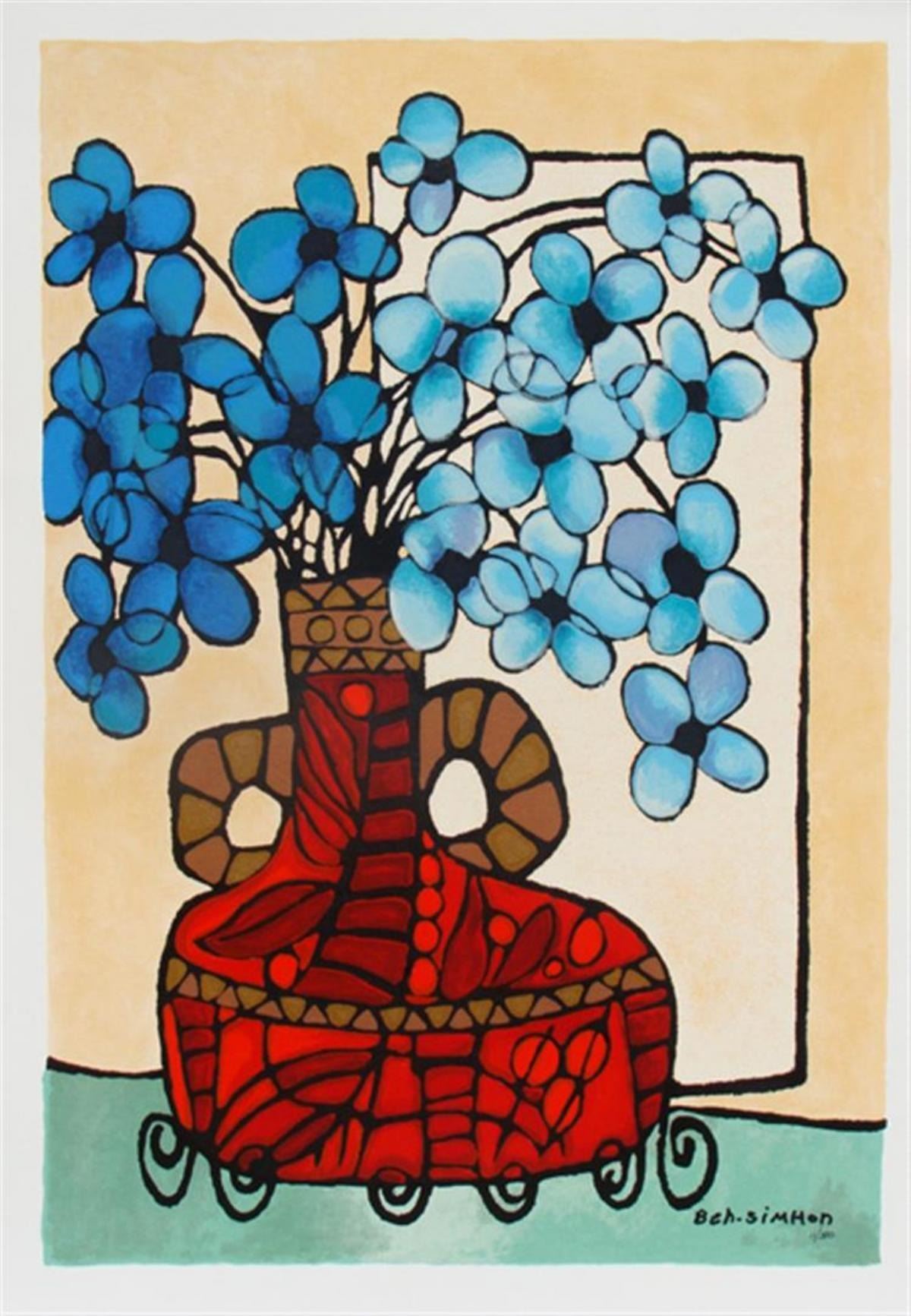 Avi Ben-Simhon Blue Flowers. Artist: Avi Ben-Simhon - Title: Blue Flowers - Medium: Serigraph on Paper - Signature: Hand-signed by the Artist - Edition: 390 - Image Size: Approximately 26 ¾ inches x 17 ¾ inches - Paper Size: Approximately 29 inches x 19 ¾
