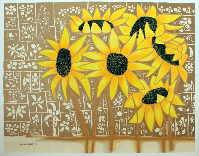 Avi Ben-Simhon Golden Wonder. Artist: Avi Ben-Simhon - Title: Golden Wonder - Medium: Serigraph on Paper - Signature: Hand-signed by the Artist - Edition: 390 - Image Size: Approximately 35 ½ inches x 47 ¼ inches - Paper Size: Approximately 37 ¾ inches x 50 inches - Unframed - Details: This work comes with a Certificate of Authenticity - Biography: Avi Ben-Simhon has been deeply inspired by Fauvist and Cubist painters, while creating his signature, unmistakable style. The element of design is strongly developed in his work, in composition and pallet, while the dramatic shapes and vibrant colors powerfully express his joie de vivre. His spiral-like motifs echo his Moroccan roots, each pattern forming an exceptional design in bright and effervescent colors.