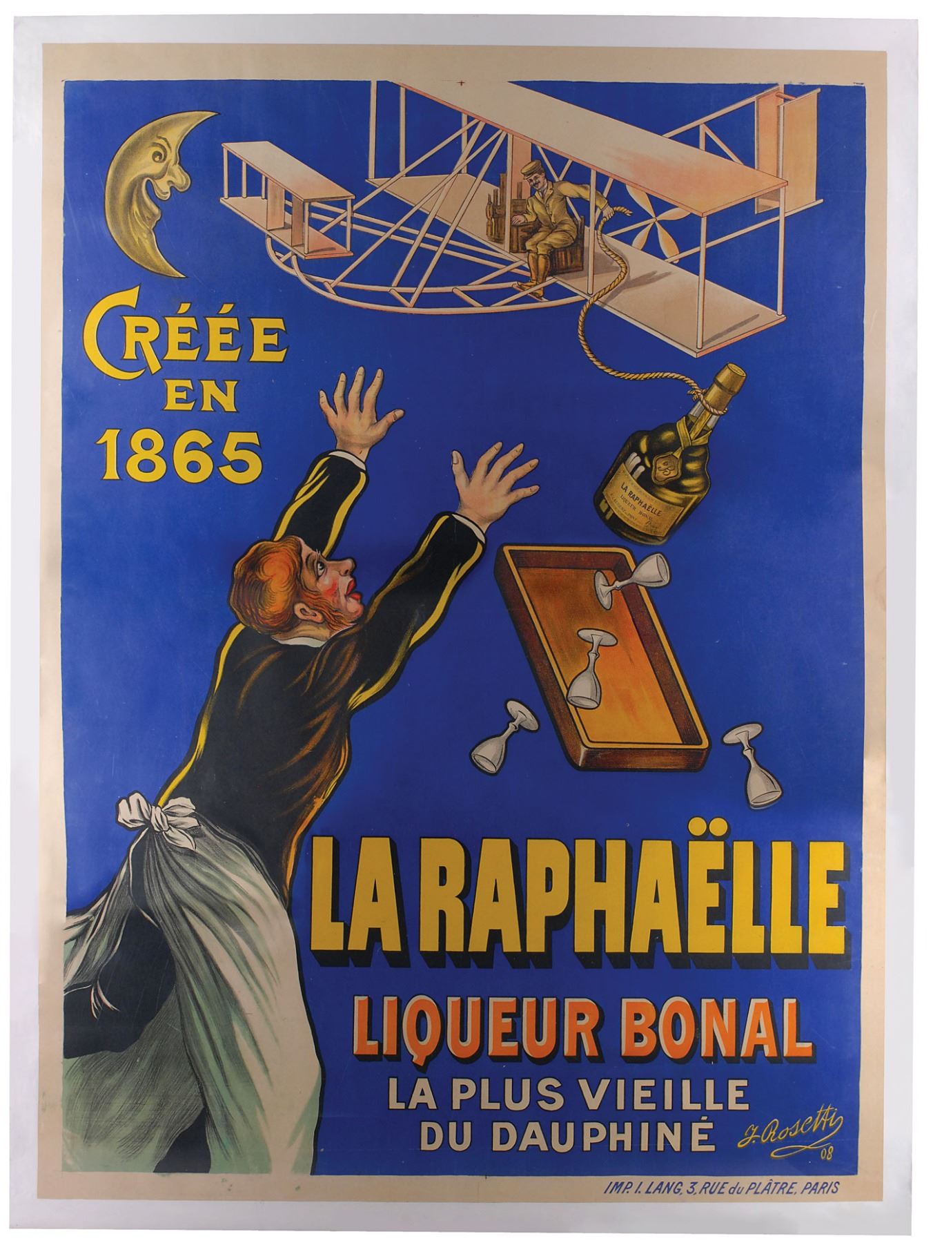 Original and very colorful French advertising poster for "La Raphaelle Liqueur Bonal," 45.5 x 62.5, done by G. Rosetti in 1908. Poster depicts a waiter having his bottle of La Raphaelle stolen by a man in an airplane. Poster has been professionally linen backed to an overall size of 49 x 65.5. Faint previous folds and wrinkles, and a small area of dampstaining to right border, otherwise fine condition. Rolled. A visually impressive piece of advertising.