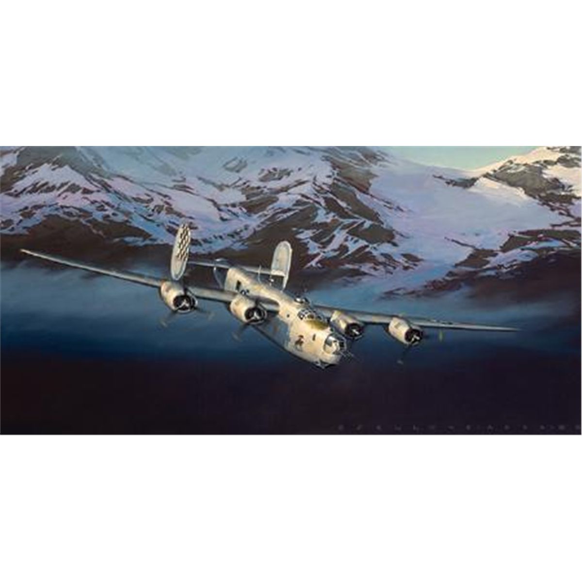 First Lt. Carl H. Fritsche levels his fuel-laden Consolidated B-24 Liberator, nicknamed "The Crusader," between cloud decks over a valley in the Himalaya Mountains between India and China. Unable to climb above the high mountain peaks because of their heavy loads, the B-24 crews relied on the skills of their navigators to guide them through the valleys and more often than not, through terrible weather (Over the HUMP.) Fritsche and his crew made 48 successful Hump flights carrying vital fuel supplies for General Claire Chennault's aircraft. Fritsche's Squadron, the 492nd Bomb Squadron of the 10th USAAF, was temporarily assigned to Chennault's 14th USAAF in China during the period of August and September 1944. * The print measures 33.25" x 16.5" and the paper trims out at 36" x 20.5". A must have for the B-24 officianato! *