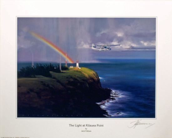 Making landfall after a long patrol, the No. 6 boat of VP-91 heads home to Southern Cross Airfield, Barking Sands, Kauai, Territory of Hawaii, in May 1942. Even though the lighthouse on Kilauea Point below had its light, and the nearby radio homing towers deactivated for wartime security, aircrews making landfall at this northernmost point in the Hawaiian Island chain always heaved a sigh of relief when seeing the solitary structure, still a beacon of hope. This L/E of 850 is S/N by the artist. It has never been mounted and is in perfect condition. It comes with a COA that is suitable for framing. The image of the print measures 16" x 11 3/4".