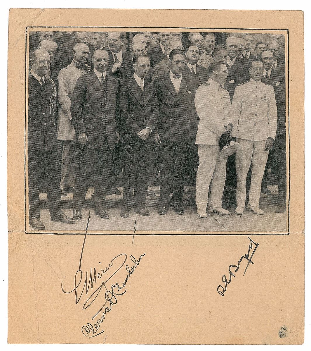 Ink signatures, “L. Bleriot,” “Clarence D. Chamberlain,” and “R. E. Byrd,” on an off-white 5.25 x 6 sheet bearing an affixed newsprint photograph of the three aviators and several others. In very good to fine condition, with creasing, soiling, and mounting remnants on the reverse.