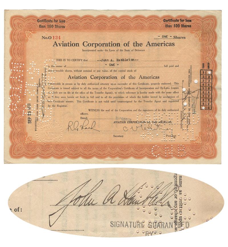 1928, New York. Stock certificate for One share of the Aviation Corporation of the Americas issued to World War I ace JOHN A. HAMBLETONand signed by him on the back. On the front, the stock is signed by CORNELIUS VANDERBILT WHITNEY as the company’s president. Whitney, the grandson of Cornelius Vanderbilt and the son of Harry Payne Whitney, was a financier who co-founded the Aviation Corporation of the Americas and Pan American Airways. Orange border and background on white paper with black printing. Punch holes affecting some of Whitney’s signature and Hambleton’s; it is in fine condition.