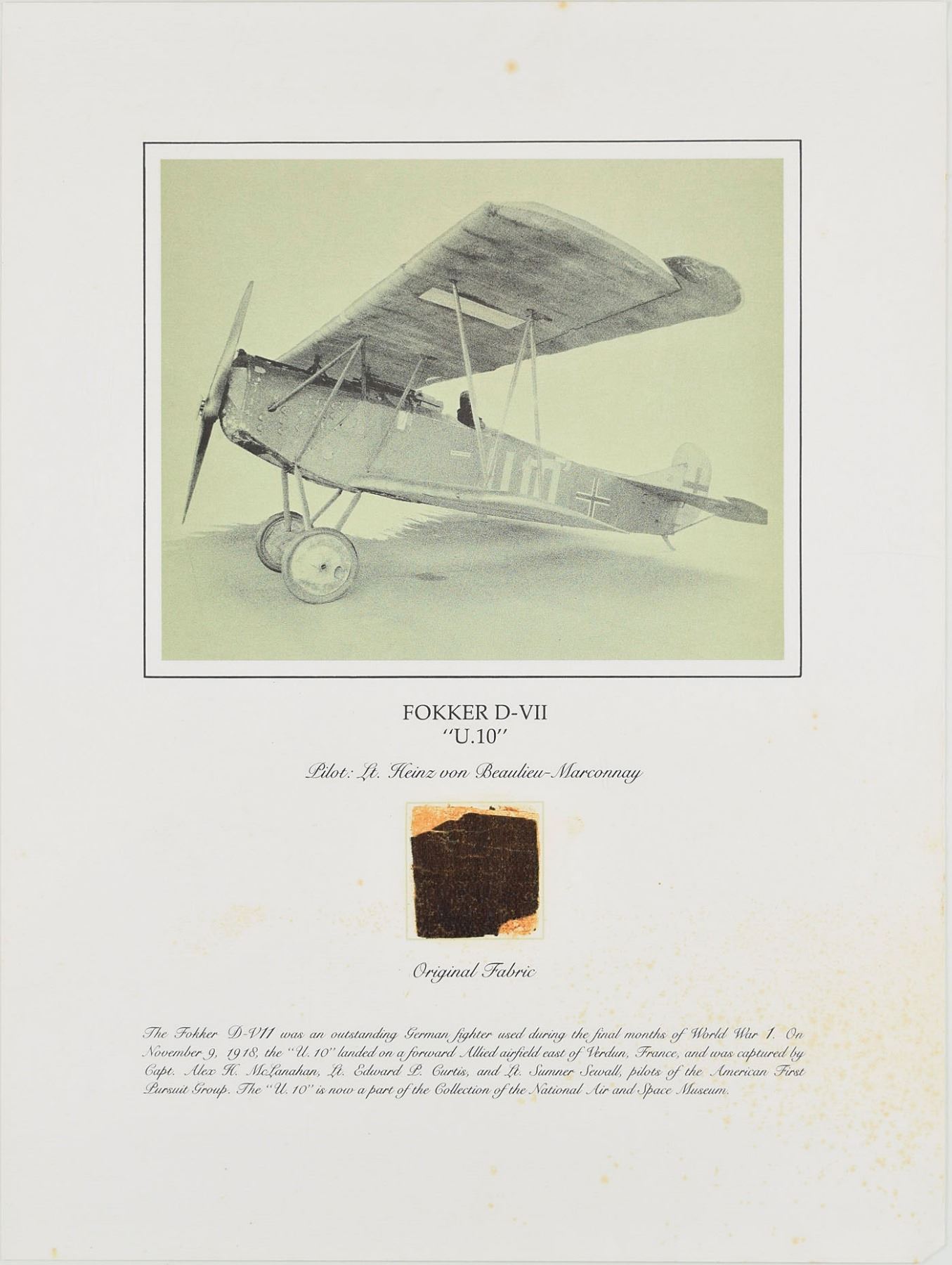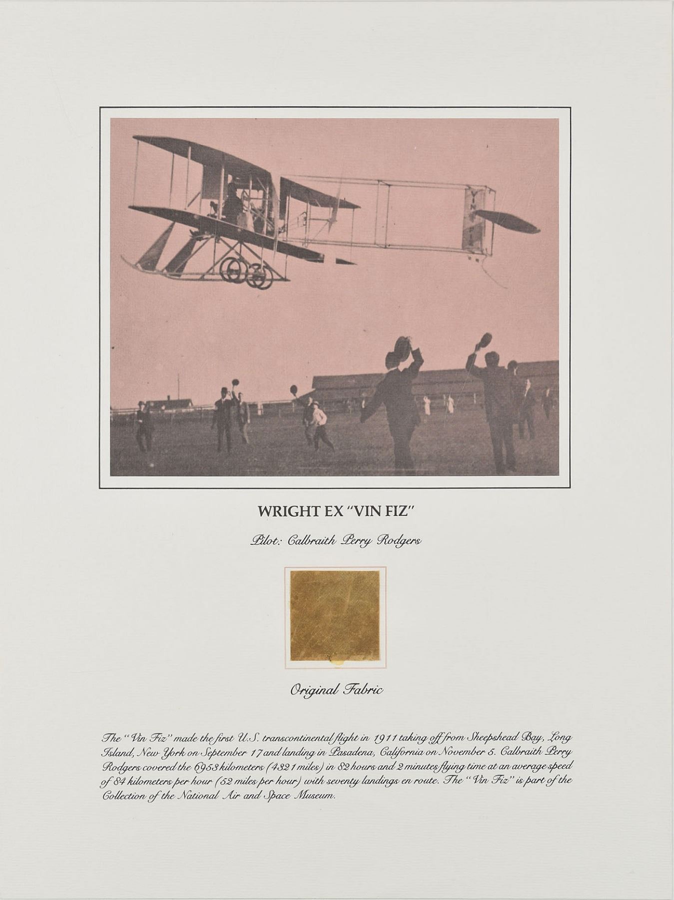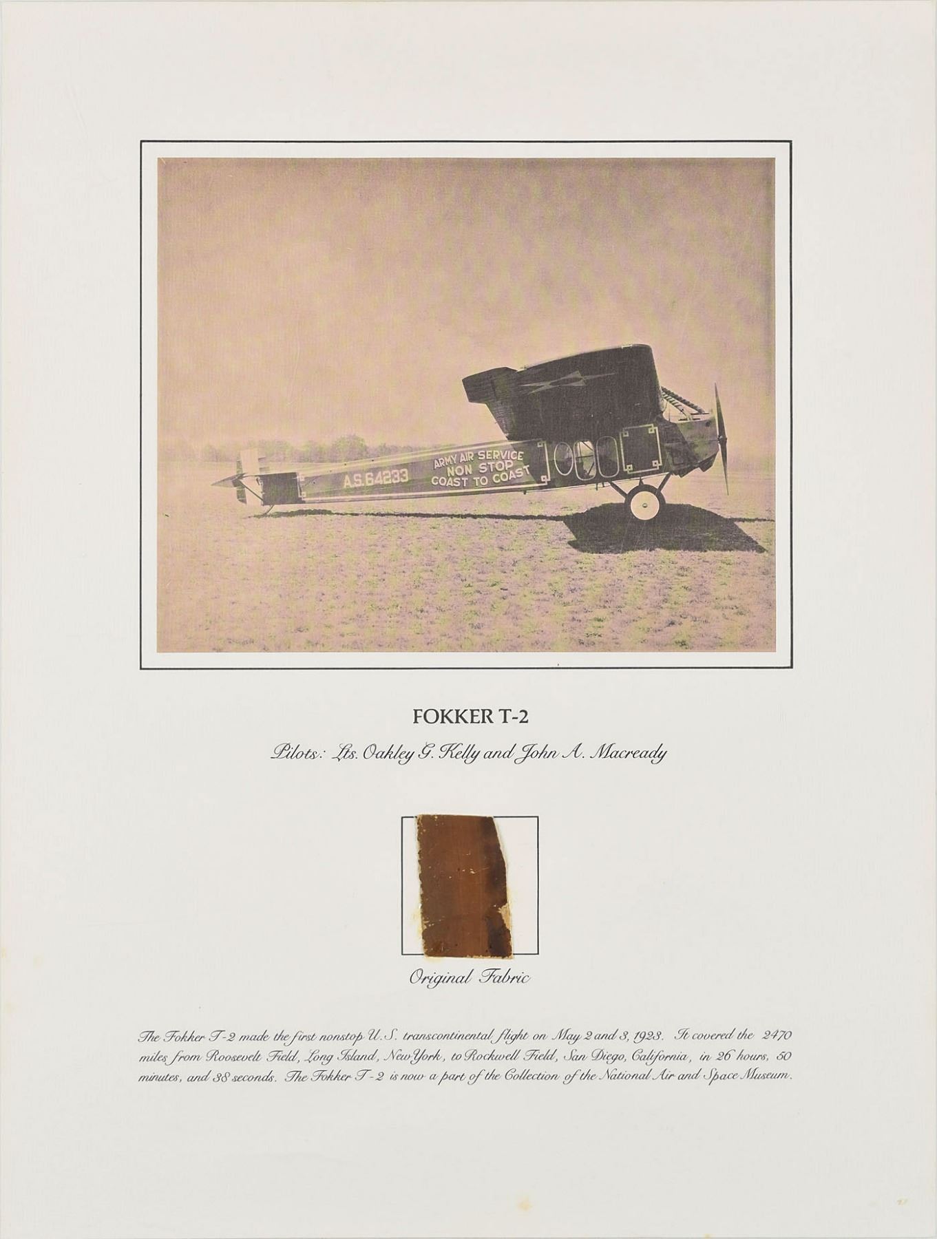 Group of six flown fabric presentations created by the Smithsonian Institution National Air and Space Museum with fabric removed during restoration of historically important aircraft. Each swatch measures about 2 x 2 and is affixed to its respective 15 x 20 informational poster. Pieces include: two brown swatches from Calbraith Perry Rodgers's Wright Brothers Vin Fiz; two brown swatches from the Curtiss NC-4 Flying Boat that made the first transatlantic flight in 1919; a dark brown swatch from Lt. Heinz von Beaulieu-Marconnay's Fokker D-VII 'U.10'; and a dark brown swatch from Oakley Kelly and John Macready's Fokker T-2. Rolled and in overall very good to fine condition, with a crack and fold to the Fokker D-VII and folding to one Vin Fiz swatch (which has come detached, but easily reaffixed). Accompanied by the original information packets issued by National Air and Space Museum.