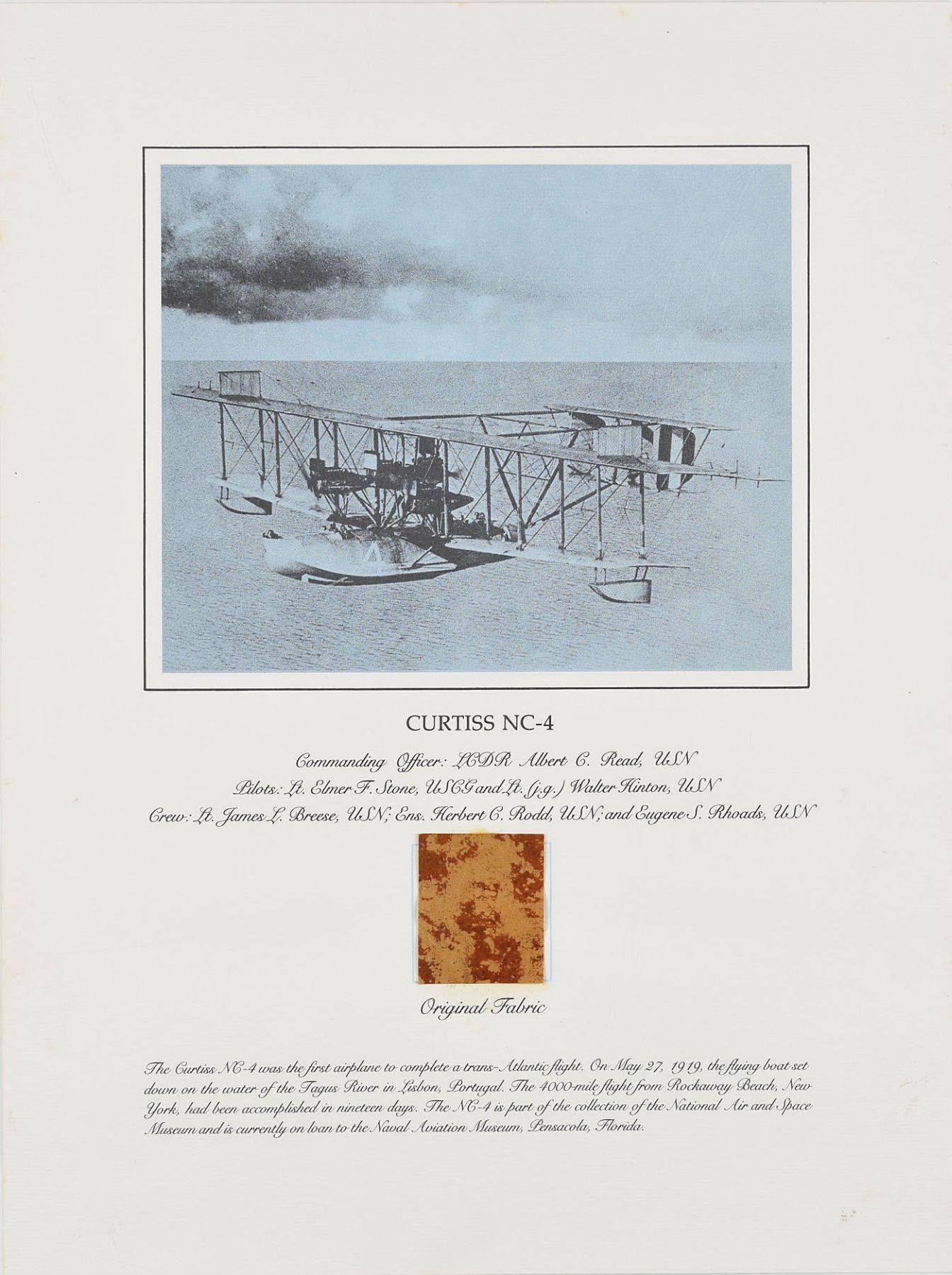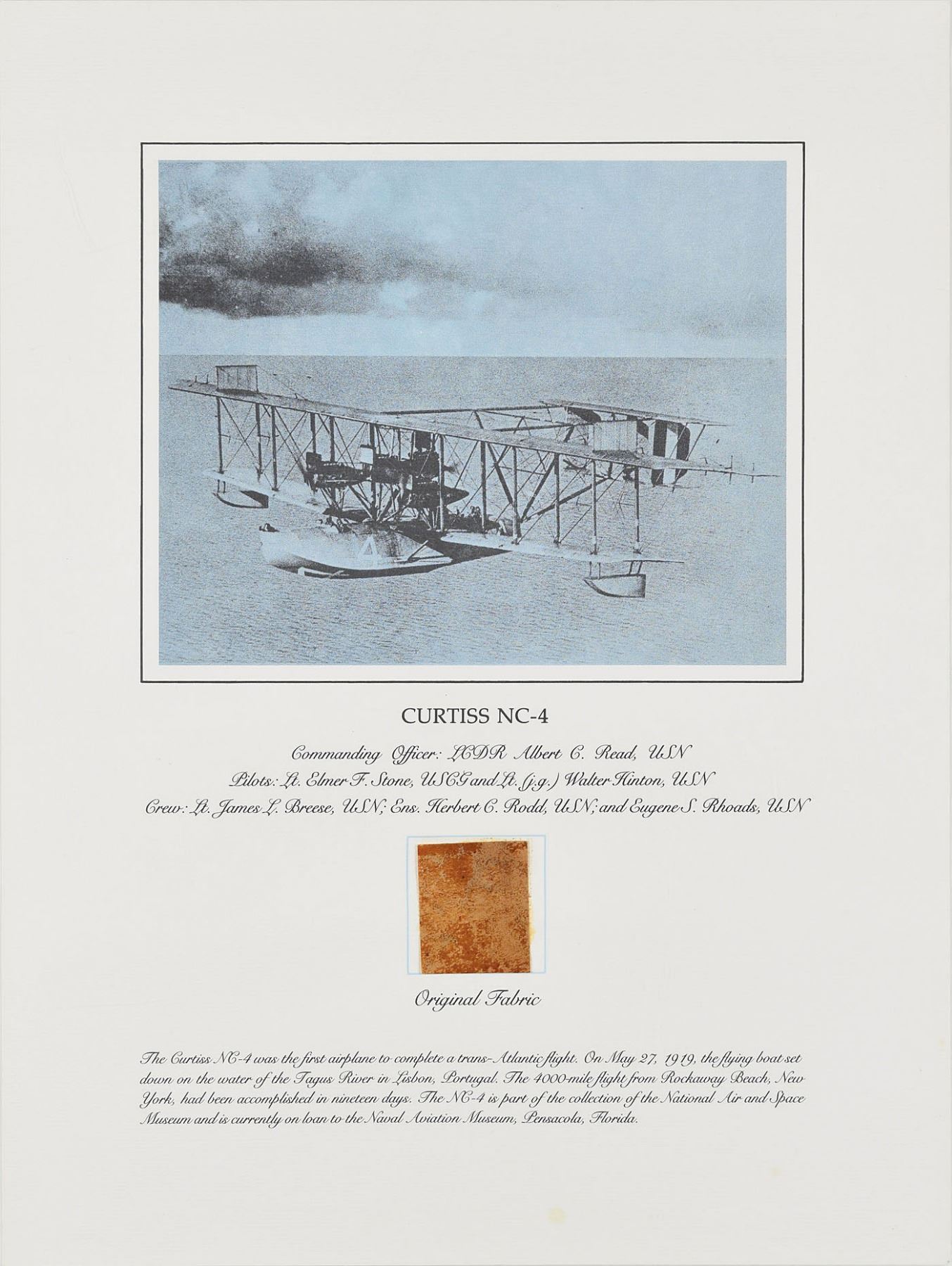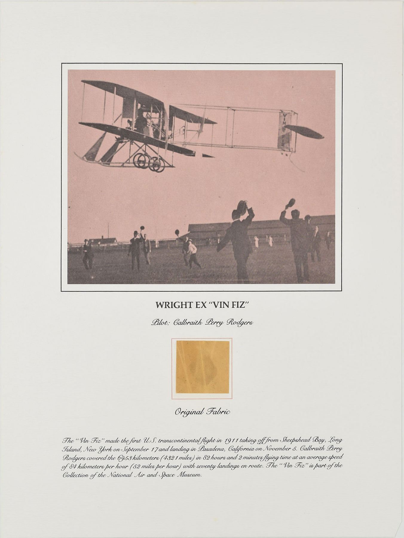 Group of six flown fabric presentations created by the Smithsonian Institution National Air and Space Museum with fabric removed during restoration of historically important aircraft. Each swatch measures about 2 x 2 and is affixed to its respective 15 x 20 informational poster. Pieces include: two brown swatches from Calbraith Perry Rodgers's Wright Brothers Vin Fiz; two brown swatches from the Curtiss NC-4 Flying Boat that made the first transatlantic flight in 1919; a dark brown swatch from Lt. Heinz von Beaulieu-Marconnay's Fokker D-VII 'U.10'; and a dark brown swatch from Oakley Kelly and John Macready's Fokker T-2. Rolled and in overall very good to fine condition, with a crack and fold to the Fokker D-VII and folding to one Vin Fiz swatch (which has come detached, but easily reaffixed). Accompanied by the original information packets issued by National Air and Space Museum.
