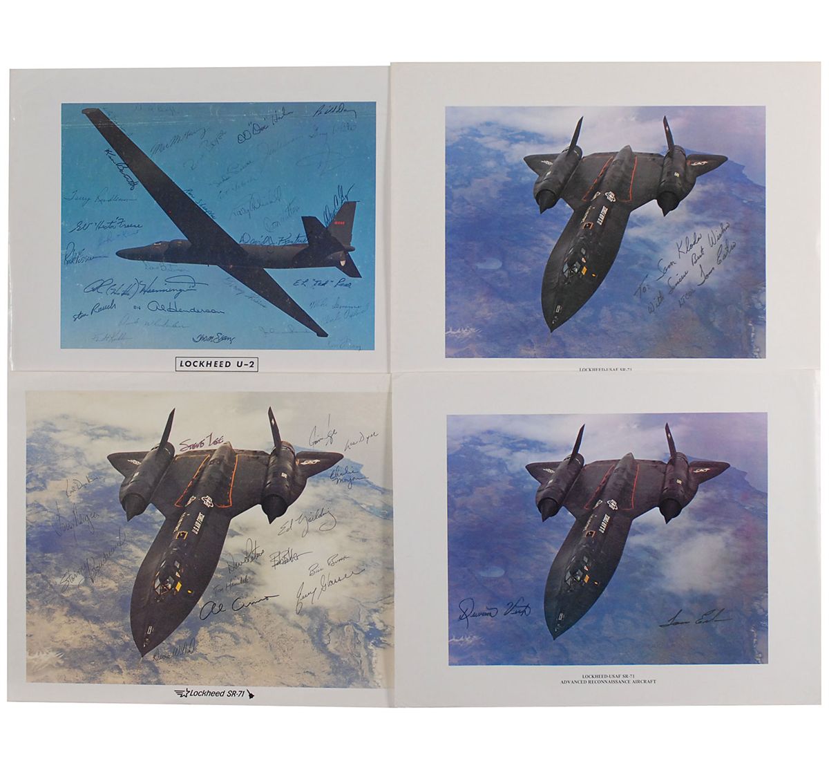 Four color 14 x 11 prints of different Lockheed aircraft, including the U-2 and SR-71, signed in ink and felt tip by a total of 49 pilots, including: Ed Yielding, Jerry Glasser, Les Dyer, Stormy Boudreaux, Tom Estes (ins), Thom Evans, ‘Tex’ Rose, Al Henderson, John Kent, Gerry White, and Rich Boyer. In very good condition, with some signatures light, but still legible, and scattered creases.