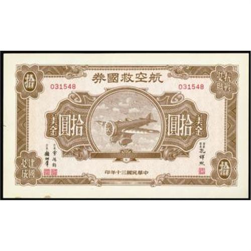 <style type="text/css"> body, td, th { font-family: Arial, Helvetica, sans-serif; font-size: 12px; color: #482424; margin: 0px; padding: 0px; } #header { background-image: url(http://www.bowersandmerena.com/ebay/images/template_v3_01.gif); clear: both; background-color: #590303; border-top-width: 2px; border-top-style: solid; border-top-color: #B38C4F; } #header #header_wrapper { height: 75px; clear: both; width: 800px; margin-right: auto; margin-left: auto; background-image: url(http://www.bowersandmerena.com/ebay/images/template_v3_03.gif); background-repeat: no-repeat; background-position: right; color: #F3EDCC; } #header #header_wrapper #header_logo { float: left; height: 75px; width: 444px; background-image: url(http://www.bowersandmerena.com/ebay/images/template_v3_02.gif); background-repeat: no-repeat; font-size: 10px; text-transform: capitalize; color: #B38C4F; } #header #header_wrapper #header_right { float: left; height: 75px; width: 356px; text-align: right; } #header #header_wrapper #header_right #headerLoginBtn { margin-bottom: 30px; } #header #header_wrapper #header_right input#txtSearch { color: #B49056; border: 1px solid #B49056; width: 175px; padding-top: 3px; padding-right: 3px; padding-bottom: 4px; padding-left: 3px; } #nav { height: 37px; background-image: url(http://www.bowersandmerena.com/ebay/images/template_v3_05.gif); clear: both; } #nav #nav_wrapper { height: 35px; width: 800px; margin-right: auto; margin-left: auto; border-left-width: 1px; border-left-style: solid; border-left-color: #B38C4F; } #nav #nav_wrapper a { padding-right: 15px; padding-left: 15px; border-right-width: 1px; border-right-style: solid; border-right-color: #B38C4F; height: 25px; padding-top: 10px; display: block; float: left; text-decoration: none; font-weight: bold; color: #5D0303; } #nav #nav_wrapper a:hover { color: #B38C4F; } #nav #nav_wrapper #search { float: right; padding-top: 7px; } #nav #nav_wrapper #search #txtSearch { font-family: Arial, Helvetica, sans-serif; font-size: 10px; text-transform: uppercase; color: #D2AE75; border: 1px solid #B38C4F; padding: 3px; } #content_bgd { background-image: url(http://www.bowersandmerena.com/ebay/images/template_v3_09.gif); background-repeat: repeat-y; background-position: center; padding-top: 15px; padding-bottom: 15px; background-color: #FBFBDB; } #content_wrapper { clear: both; height: auto; width: 800px; margin-right: auto; margin-left: auto; } .LotDetailWhite { line-height:normal; font-size:13px; font-family: arial,helvetica,sans-serif; color: White; font-weight: bold; } .LotDetailInformation { line-height:normal; font-size: 13px; font-family: arial,helvetica,sans-serif; } .LotDetailMessage { line-height:normal; font-size: 13px; font-family: arial,helvetica,sans-serif; color: red; } } tr.HeaderAuctionTitle td { color: #000000; font-weight: bold; padding: 2px; background-image: url(http://www.bowersandmerena.com/ebay/images/template_v3_05.gif); background-repeat: repeat-x; border-bottom-width: 1px; border-bottom-style: solid; border-bottom-color: #B38C4F; } table.AuctionSummary a, table.AuctionSummary a:link, table.AuctionSummary a:visited { color: #0000FF; text-decoration: none; } } td.tableHeaderLeft { border-left-width: 1px; border-left-style: solid; border-left-color: #B38C4F; } td.tableHeaderRight { border-right-width: 1px; border-right-style: solid; border-right-color: #B38C4F; } td.tableCellMiddle { border-left-width: 1px; border-left-style: solid; border-left-color: #B38C4F; border-right-width: 1px; border-right-style: solid; border-right-color: #B38C4F; padding: 5px; } tr.footer td { border-top-width: 1px; border-top-style: solid; border-top-color: #B38C4F; } </style> </head> <body> <div id="header"> <div id="header_wrapper"> <div id="header_logo"> </div> <div id="header_right"> </div> </div> </div> <div id="nav"> <div id="nav_wrapper"> <a href="http://www.bowersandmerena.com">Our eBayLive Auctions</a> <a href="#PaymentInfo">Payment Information</a> <a href="#ShippingInfo">Shipping Information</a> <a href="#About">About Bowers and Merena</a> </div> </div> <div id="content_bgd"> <div id="content_wrapper"> <table width="100%" border="0" cellpadding="5" cellspacing="0" class="AuctionSummary"> <tbody> <tr class="HeaderAuctionTitle" style="height: 25px;"> <td align="left" class="tableHeaderLeft" > </td> <td align="center" class="tableHeaderRight"> <span style="font-size: large;">Lot #876. Military Issues. Aviation--Save the Nation Coupon.</span> </td> </tr> <tr> <td colspan="3" class="tableCellMiddle"> 1941, U.S.$10, (Chinese Catalog, Vol. 14 Pg. 148), Issued note, war plane in middle, Unc. Scarce.