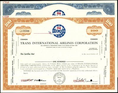 NV, AZ, DE. 1960's. Specimen. 4 different stock certificates. 1)-2) Trans International Airlines Corp. Odd shs, blue; 100 shs, orange. Both with jet, blue circle and letter logo. 3) Valley Airlines. Arizona. Odd shares, Blue. 4) Vought Aeronautics Corp. Odd shares, green. Angel with hi-tech weapons. ABNC. XF.