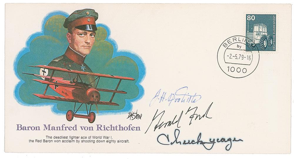 Two different commemorative covers, 7.5 x 3.75, from the International Aerospace Hall of Fame Pioneers of Flight series honoring Alan Shepard and Baron Manfred von Richthofen, respectively. The first cover is signed in ink or felt tip by Alan Shepard, Chuck Yeager, J. H. Doolittle, and President Gerald Ford; the second cover is signed by Doolittle, Yeager, and Ford. In fine condition, with bleeding to Yeager’s signature on one envelope and light edge toning. Accompanied by two biographical cards and an original mailing envelope.