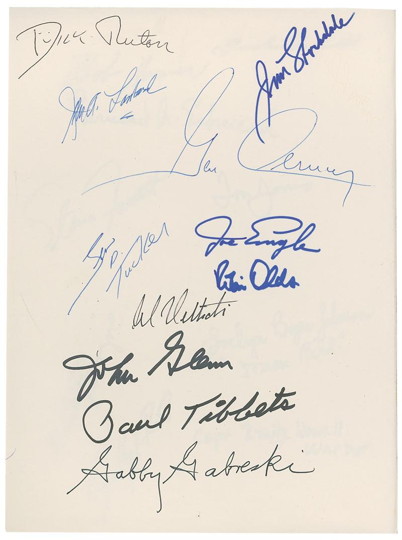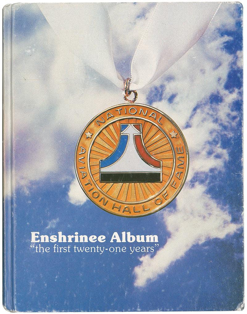 Signed book: National Aviation Hall of Fame Enshrinee Album. First edition. Ohio: National Aviation Hall of Fame, 1984. Hardcover, 8.75 x 11.25, 230 pages. Signed on the opening and closing pages in felt tip and ink by 37 inductees including: Gene Cernan, John Glenn, Tom Stafford, Frank Borman, Sally Ride, Chuck Yeager, Scott Crossfield, Tex Hill, Paul Tibbets, Gabby Gabreski, Joe Engle, Dick Rutan, Joe Foss, Bob Hoover, Steve Fossett, Fred Smith, Fitz Fulton, Pete Knight, Bernard Schriever, Joe Kittinger, John Paul Stapp, Harry Coombs, Cliff Robertson, Patty Wagstaff, Paul Poberezny, Albert Ueltschi, Walter Boyne, Fred Smith, Emily Howell Warner, Evelyn Johnson, Harry Coombs, Sean Tucker, Jim Stockdale, and Robin Olds. The following have also signed again on the interior pages by their biographical information and photo: Frank Borman, Gabby Gabreski, Tex Hill (signing on Chennault’s page) and Scott Crossfield. In fine condition, with some bleed through to some of the signatures, front hinge a bit loose, and scattered wear and corner bumps to covers.