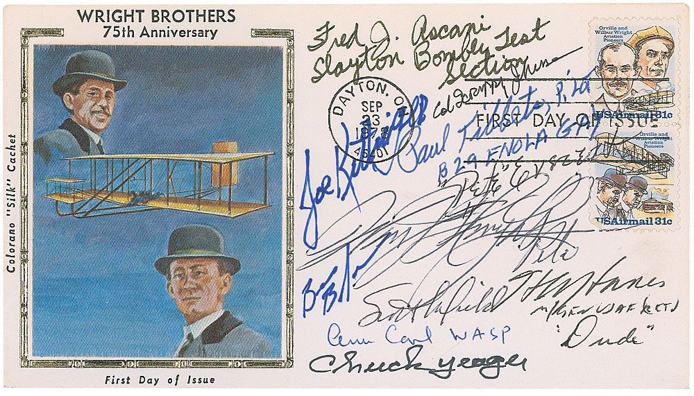 Commemorative cover with a cachet honoring the 75th anniversary of the Wright brothers’ flight, signed in felt tip and ink by 11 aviation greats including Paul Tibbets, Scott Crossfield, Chuck Yeager, Pete Everest, and Joe Kittinger. In fine condition.