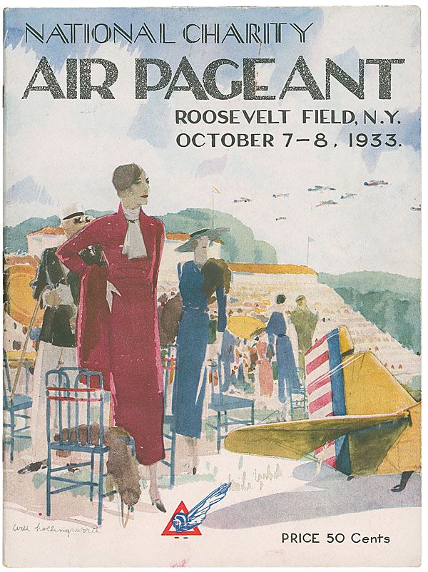 Original program, 9 x 12, 84 pages, for the National Charity Air pageant held on October 8–9, 1933, at Roosevelt Field, New York. Great program full of interesting articles on aircraft and flying techniques. A ticket stub to the event is paper clipped to the first page. In fine condition, with some light handling wear and a rusty paperclip mark.