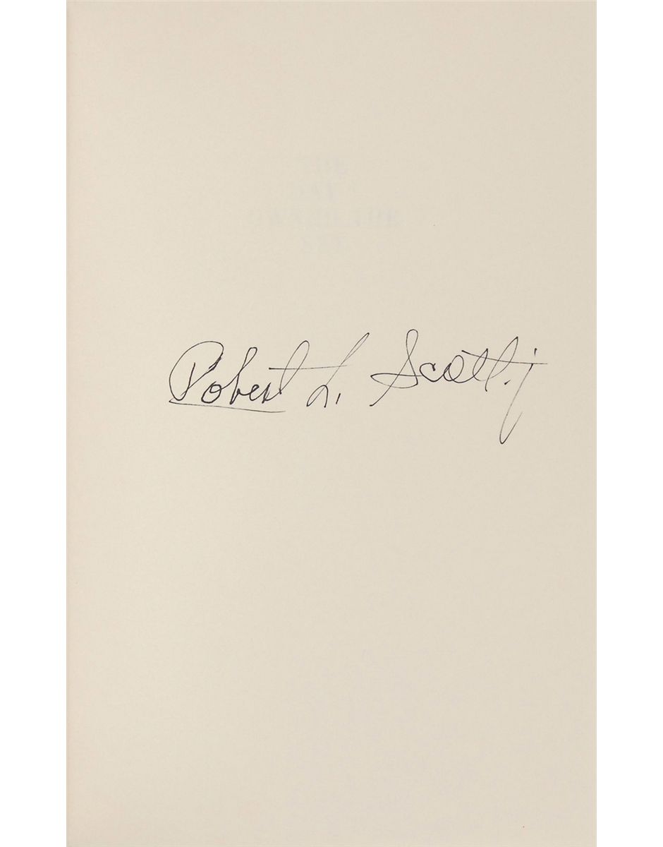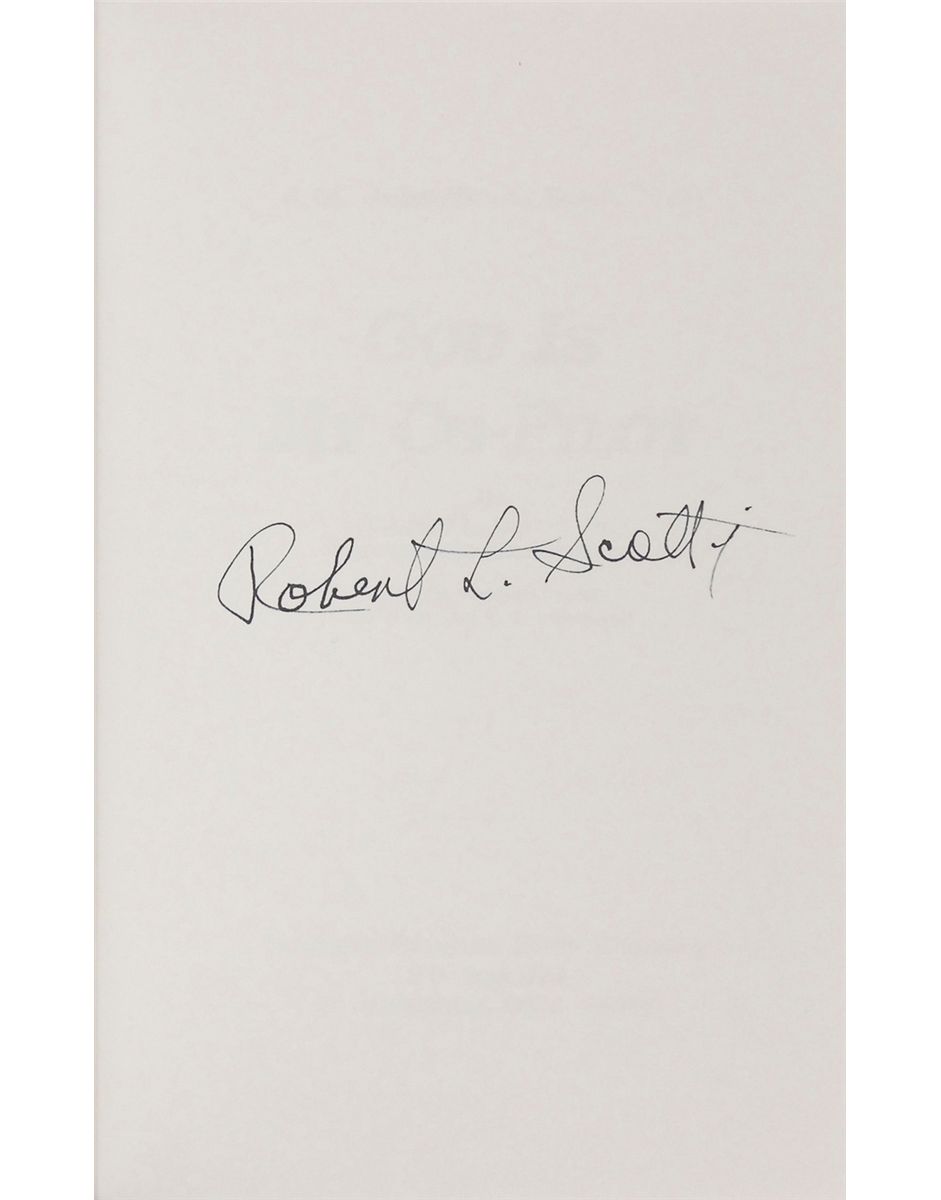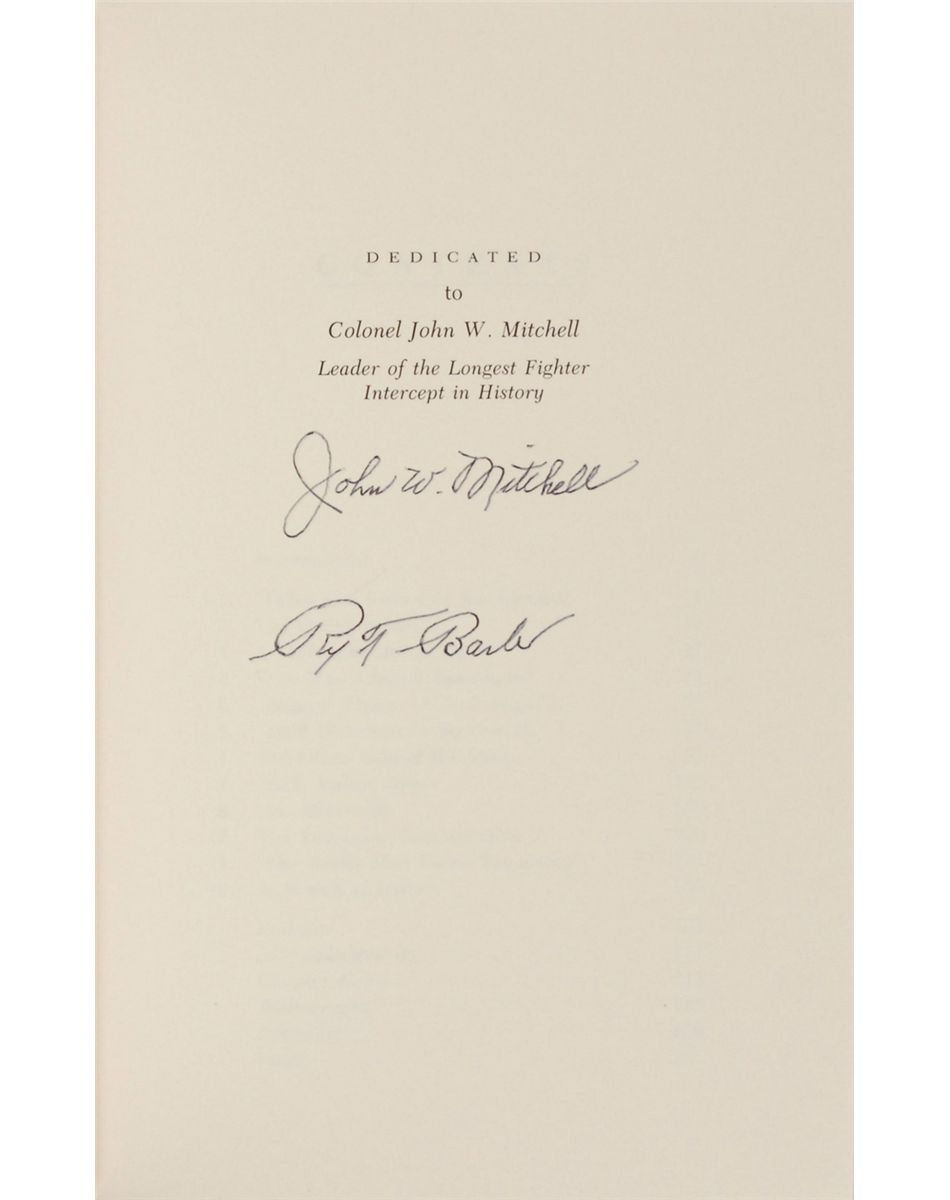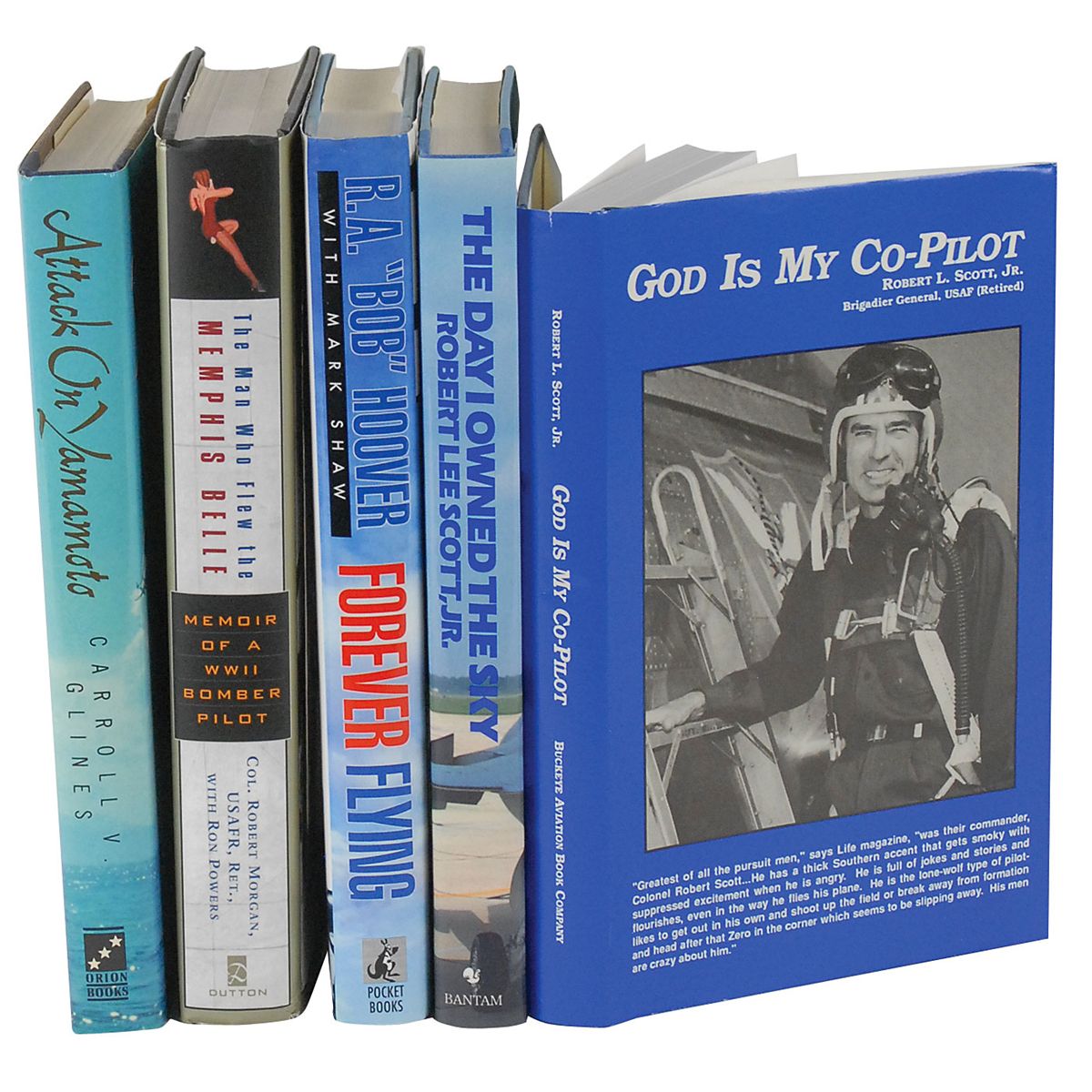Collection of five hardcover books, each signed on an opening page by the aviator and/or author. Signers are: Robert Morgan (The Man Who Flew the Memphis Belle); John Mitchell and Rex Barber (Attack on Yamamoto); Robert Scott (2; God is My Copilot and The Day I Owned the Sky); and Bob Hoover (Forever Young). In overall fine condition.