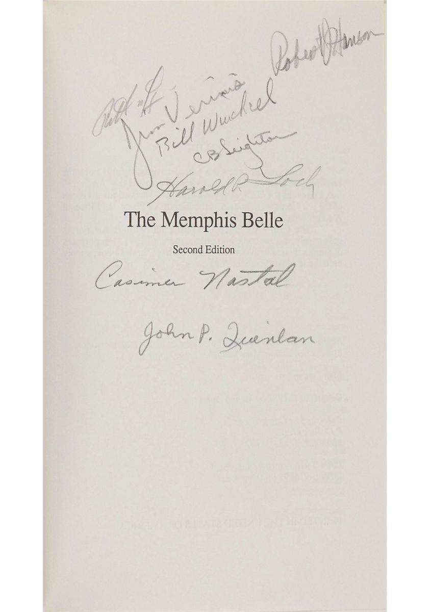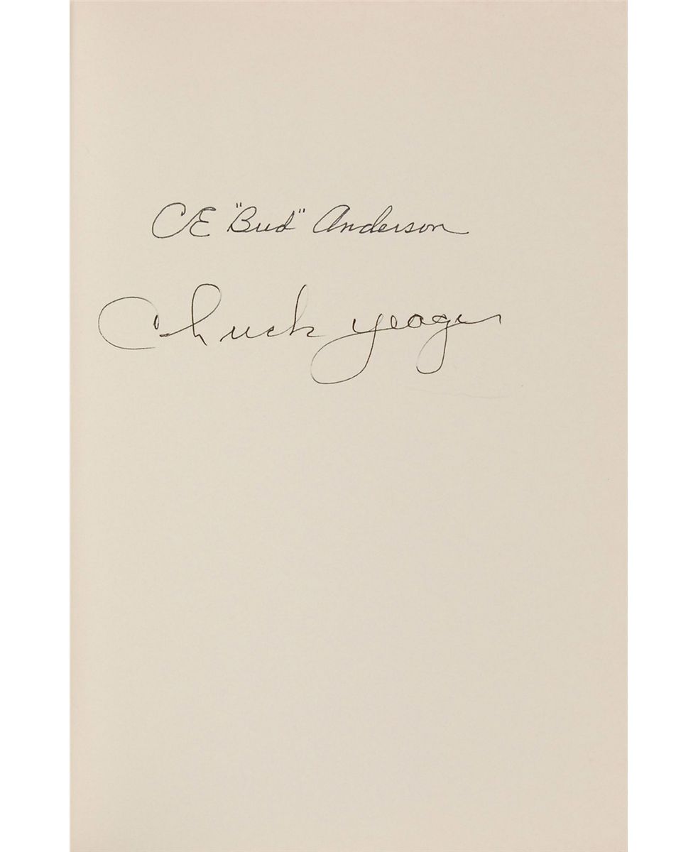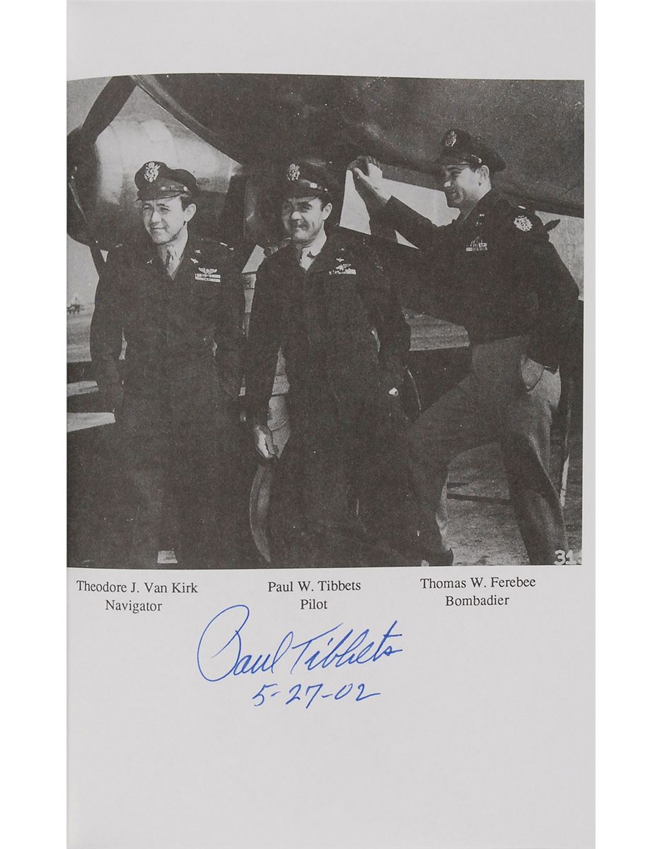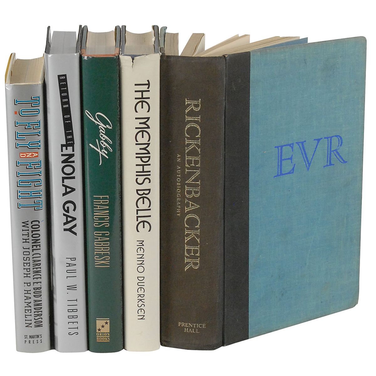 Collection of five hardcover books, each signed on an opening page by the aviator and/or author. Signers are: Paul Tibbets (Return of the Enola Gay); Chuck Yeager and Bud Anderson (To Fly and Fight); Gabby Gabreski, Pete Peterson, and Kit Carson (Gabby); Eddie Rickenbacker (Rickenbacker); and Memphis Belle crew members Robert Morgan, Jim Verinis, Harold Loch, Robert Hanson, Casimer Nastal, John Quinlan, Charles B. Leighton, and Bill Winchell (The Memphis Belle). In overall fine condition, with some spine and hinge wear to Rickenbacker’s book.