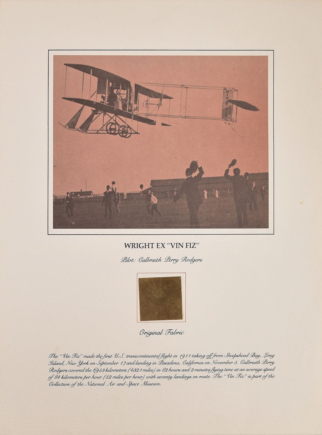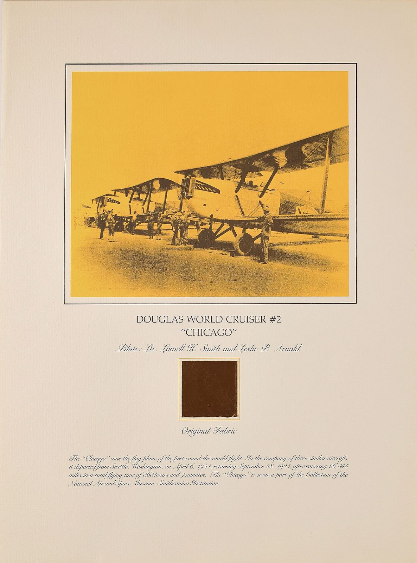 Pair of two flown fabric presentations created by the Smithsonian Institution National Air and Space Museum with fabric removed during restoration of historically important aircraft, each swatch measuring about 2 x 2 and affixed to a 15 x 20 informational poster. Includes: a brown swatch from Calbraith Perry Rodgers's Wright Brothers Vin Fiz, which made the first US transcontinental flight in 1911; and a dark brown swatch from the Douglas World Cruiser 'Chicago' that made the first around-the-world flight in 1924. In overall fine condition.