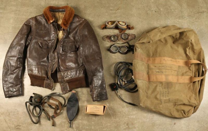'H.J. Heinrich' on bag includes a leather flight jacket with shearling collar-shows age, four pairs of goggles-one of which has come away from the frame, mask and more.