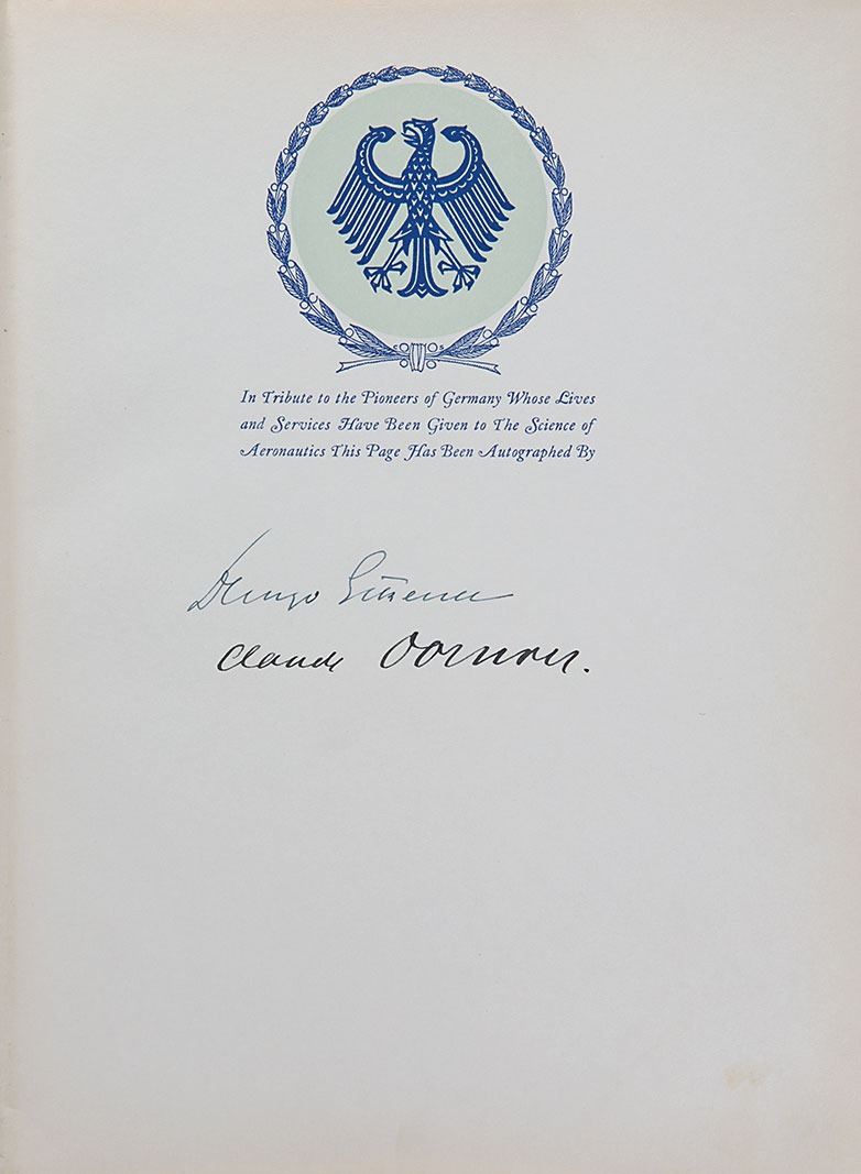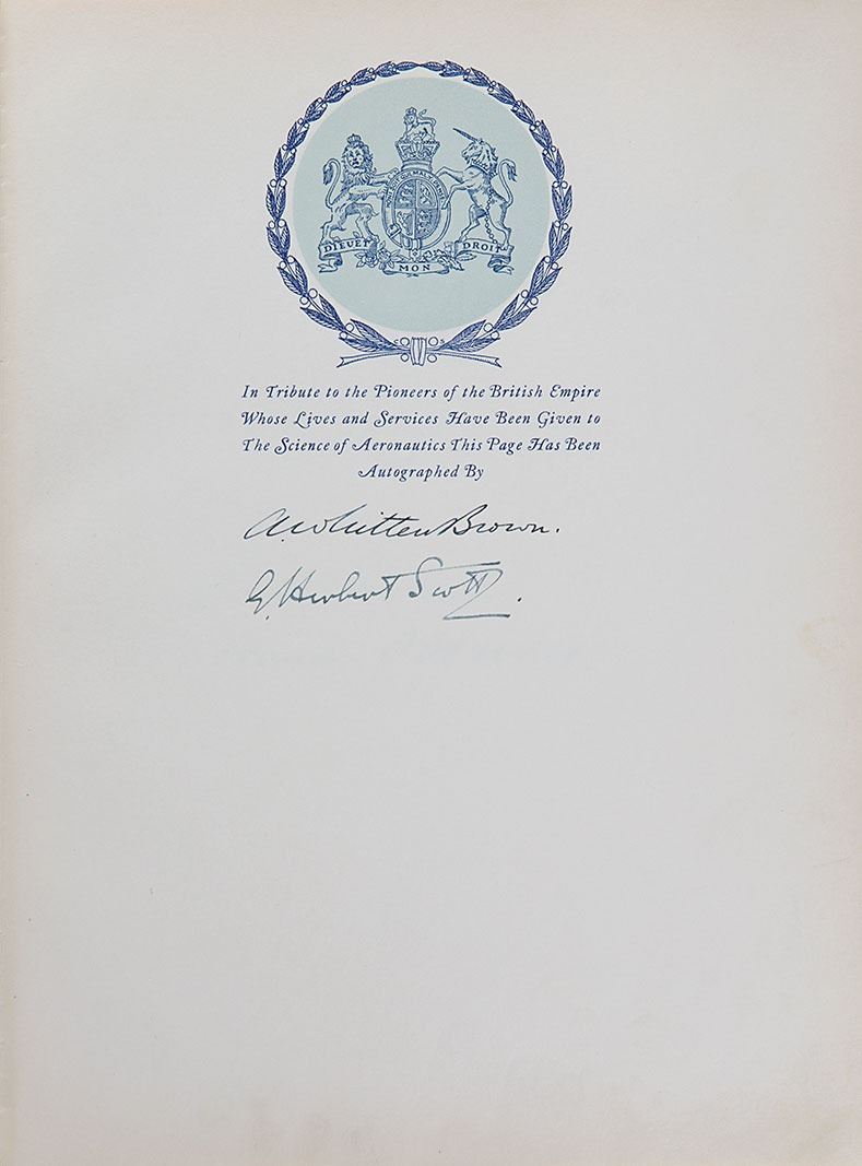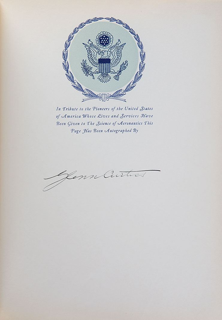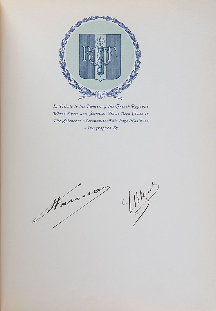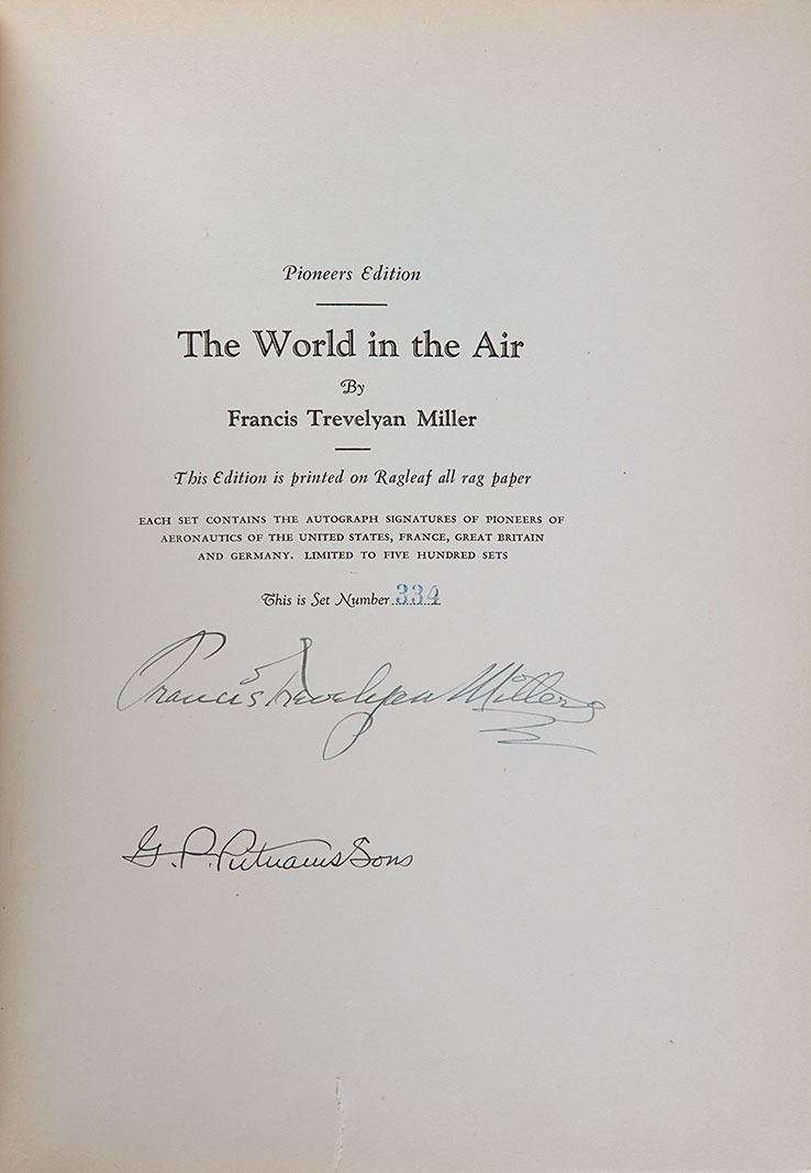 Signed book: The World in the Air by Francis Trevelyan Miller. First edition, limited issue, numbered 334/500. NY: G. P. Putnam’s Sons, 1930. Hardcover, 8.5 x 11.5, 315 pages. Signed by the author and publisher on the colophon, as well as by seven noted pioneers of aeronautics on the opening presentation pages, including: Glenn Curtiss, who made the first public flight in America; Dr. Hugo Eckener, commander of the 'Graf Zeppelin,' who made the first airship flight around the world; Louis Bleriot, who made the first airplane flight across the English Channel; Dr. Claude Dornier, German designer and builder of multi-engined aircraft; Henri Farman, who made the first distance flight in Europe; Major G. H. Scott, commander of the first Trans-Atlantic voyage in an airship in 1919; and Lieut. Arthur Whitten Brown, co-commander of the first nonstop airplane flight across the Atlantic in 1919. Autographic condition: fine, with a short tear to the bottom of the colophon. Book condition: VG-/None, with light wear, bumps to corners, soiling to covers, some slight page separation to fragile binding inside, and partial separation of spine from binding.