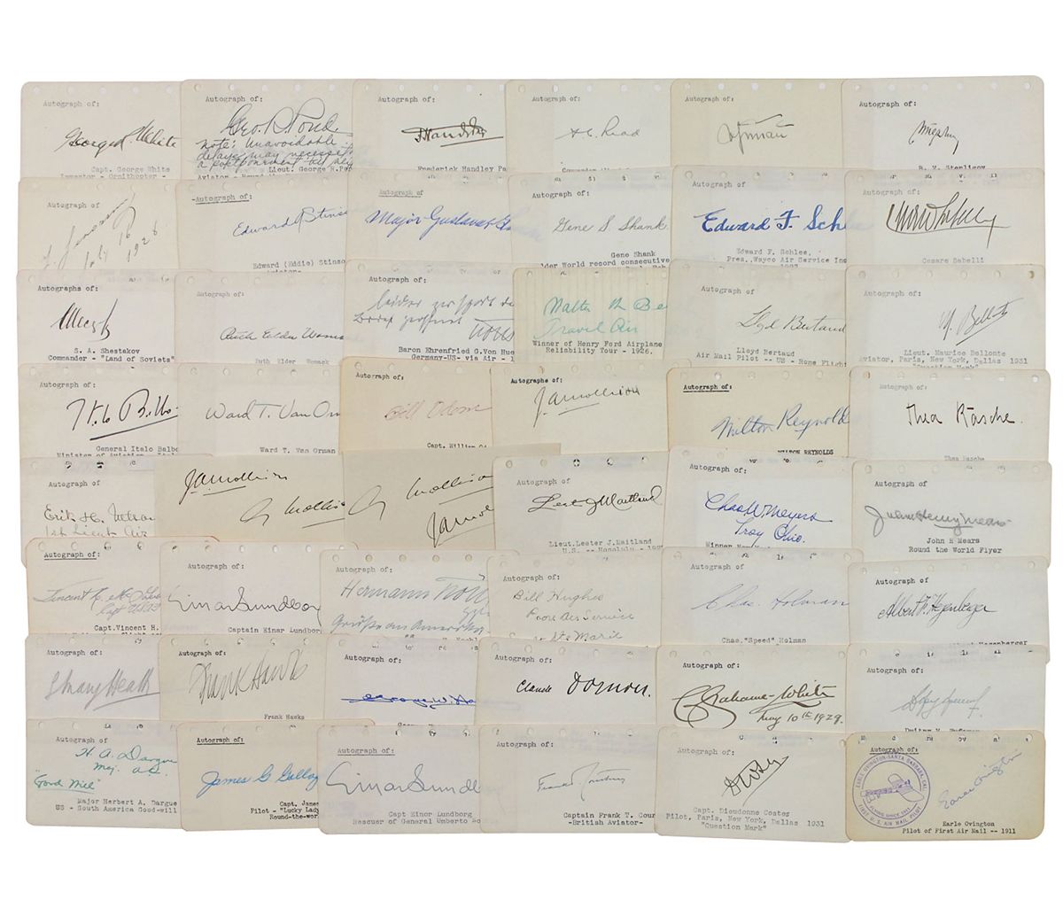 Collection of approximately 58 signatures of aviators, the vast majority in ink with a few in pencil, primarily on individual off-white 4.5 x 2.5 pages, some lined. Signers include: Italo Balbo, Walter Beech, Clarence D. Chamberlin, Claude Grahame-White, Frank Hawks, Earle Ovington, Amy and Jim Mollison, and Igor Sikorsky. In overall fine condition, with light edge toning.