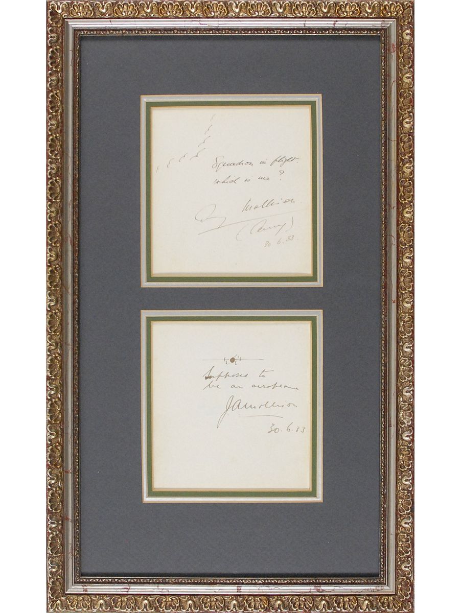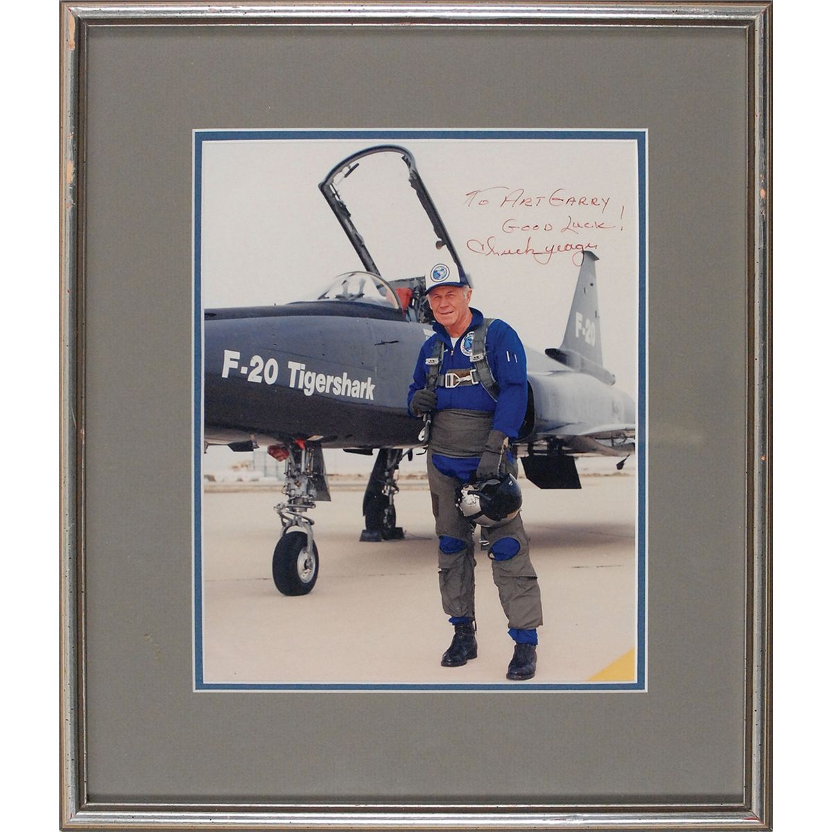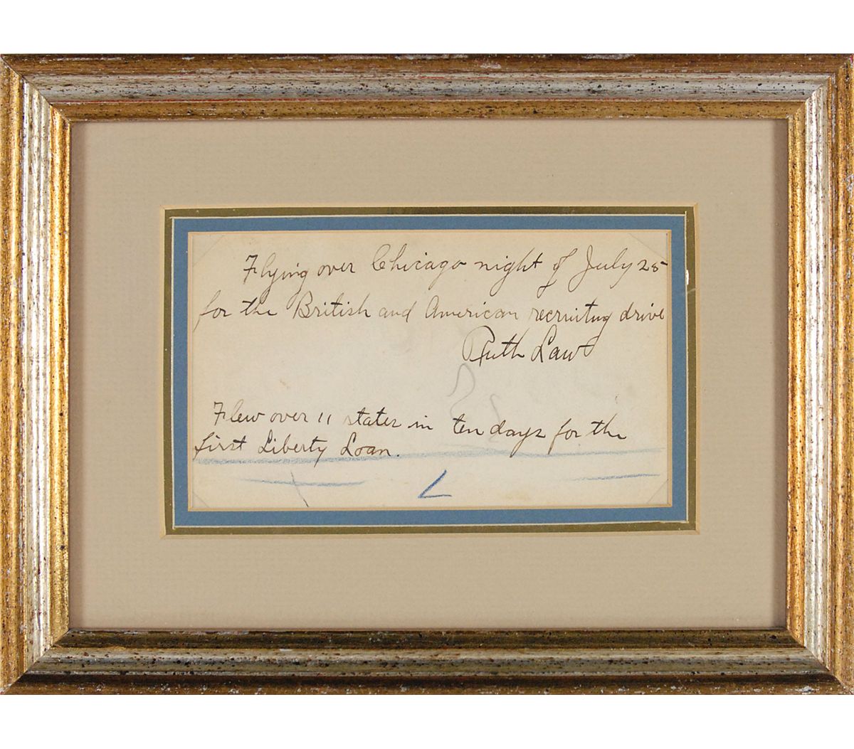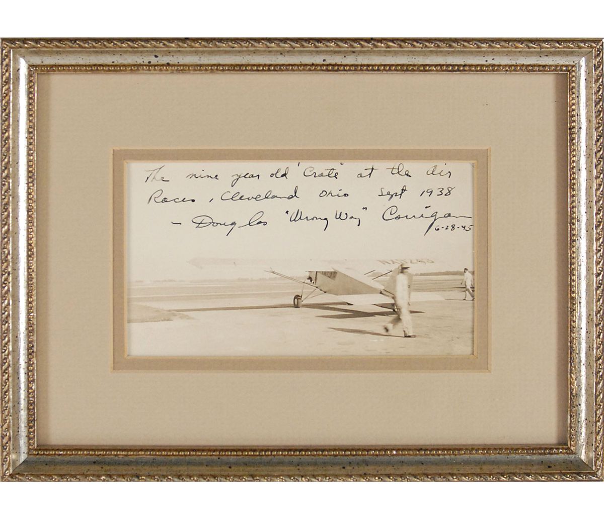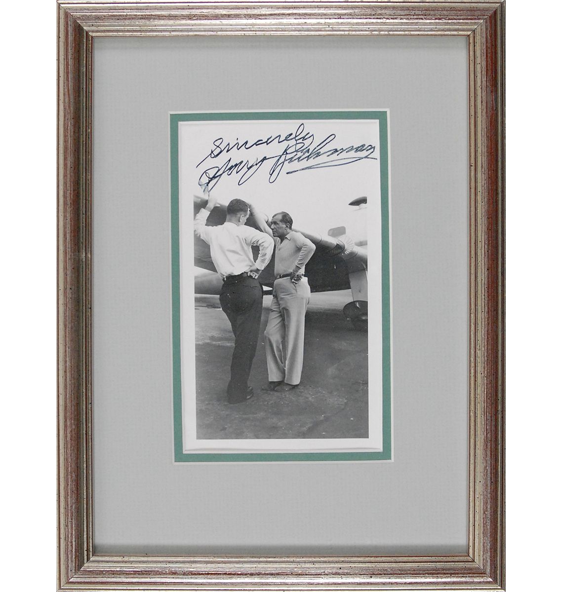 Collection of 14 framed items, primarily comprised of photos signed by famous aviators, including: Harry Richman (SP); Walter Hinton, James L. Breese, and Eugene S. Rhoads (SP); Ruth Bancroft Law (ANS); Dick Merrill (airmail cover); Douglas ‘Wrong Way’ Corrigan (SP); Clyde Pangborn (SP); Clarence Chamberlin (SP); Major Alfred Joseph Williams (SP); Chuck Yeager (SP); Frank Hawks (SP); Katherine Stinson (fabric); Amy Johnson and Jim Mollison (signatures); Elly Beinhorn (SP); and one other. All are attractively matted and framed to overall sizes ranging from 6 x 9 to 15 x 22. In overall very good to fine condition. An outstanding assemblage of aviation legends and innovators.