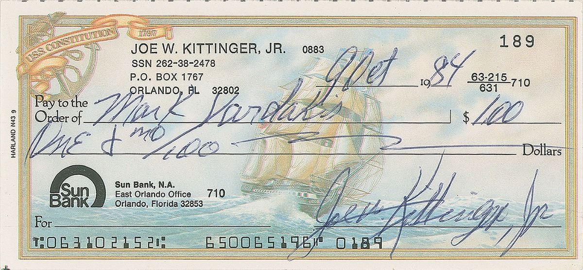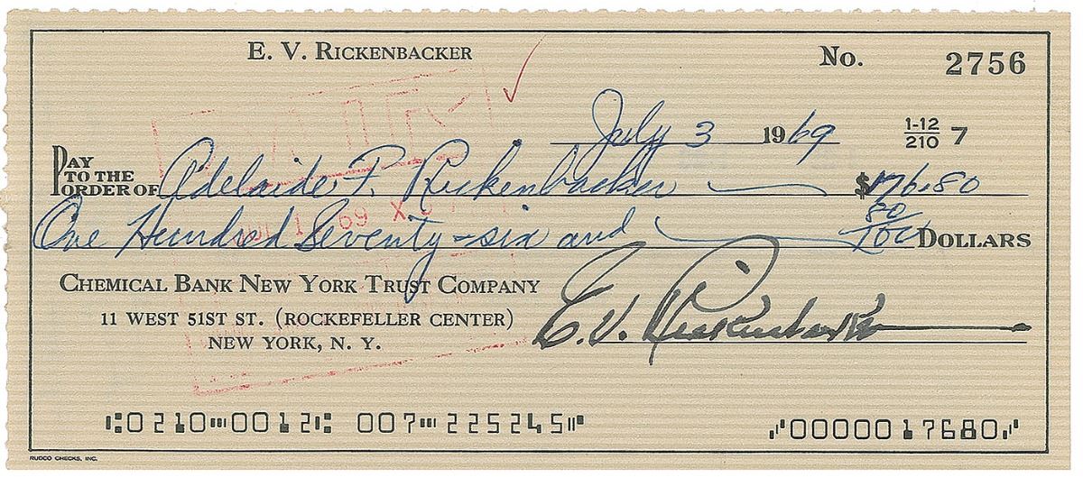 Collection of eleven checks, each signed by an aviator, including: Walter Wellman, Richard E. Byrd (3), St. Clair Streett, Ralph Cousins, Igor Sikorsky, Eddie Rickenbacker, Pappy Boyington, Joe Kittinger, and Boris Sergievsky. In overall fine condition.