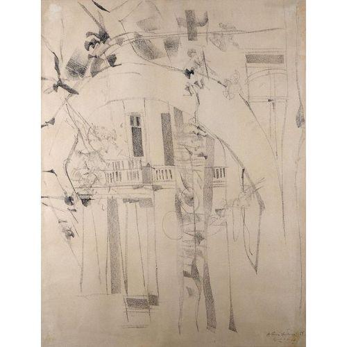 Avigdor Arikha<BR>Israeli painting<BR>B. 1929<BR>A Building in Jerusalem<BR>1955<BR>Charcoal<BR>64x49 cm<BR>Signed and dated.