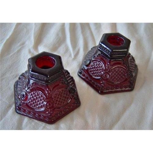 These single light candleholders are a must for your table and to accompany the rest of your Avon Cape Cod Ruby Crystal collection! They are a pair and measure 2 3/8 inches tall. They are in excellent condition. Again, they are a part of the Avon's 1876 Cape Cod Collection. <p>Shipping is determined after checkout. <p>
