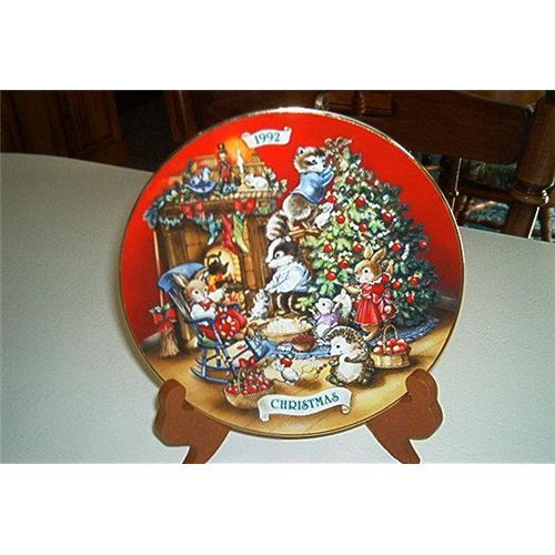The title of this Avon plate is: Sharing Christmas with Friends". It is a 1992 Red Christmas plate with animals decorating the tree. It a porcelain plate, trimmed in 22K Gold. The back of the plate state Fine AVON 1992 Collectibles. The plate measures 8 inches in diameter.