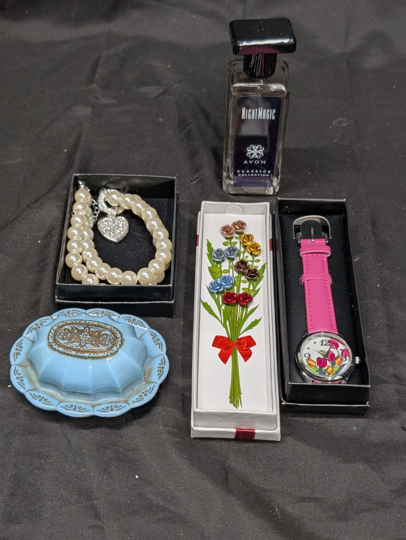 Avon Items heart charm Necklace, Ravishing Rose, 6 Pair Earring set, and etc. as shown