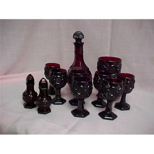 This is a delightful decanter set. It is the Cape Cod collection and has a wonderful ruby red color. The set consists of a decanter with stopper, 7 cordial glasses, 1 water goblet and a set of salt and pepper shakers.