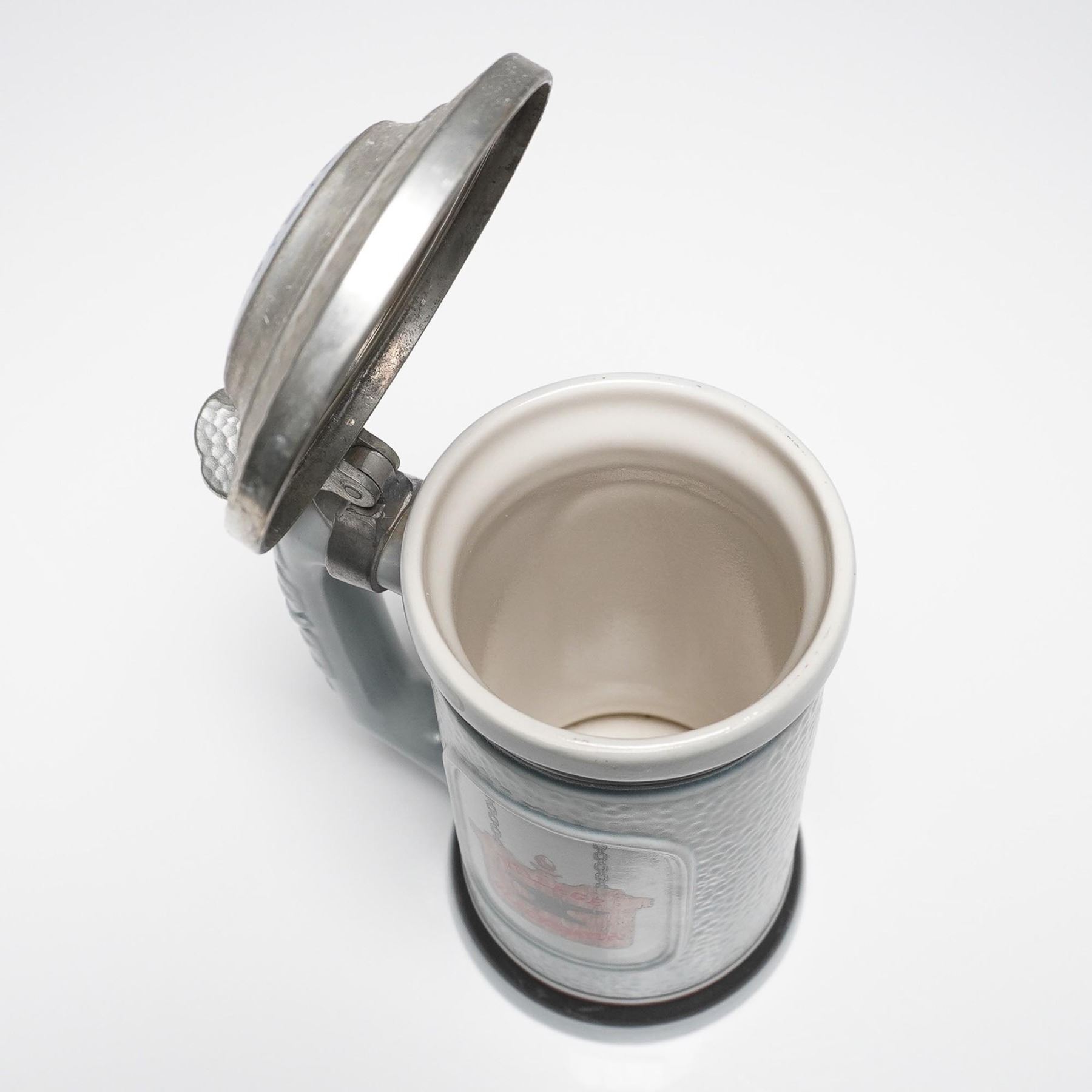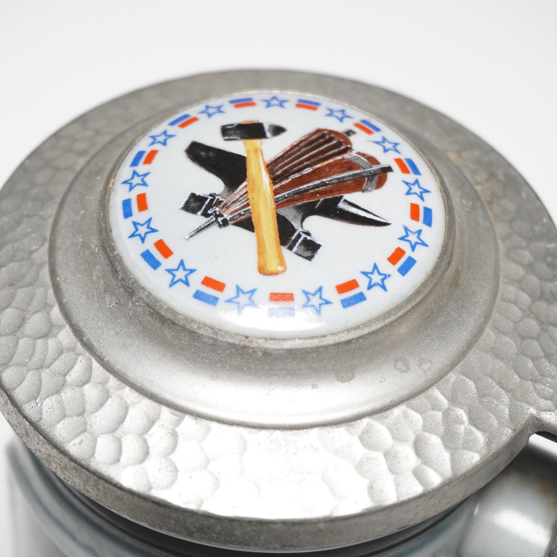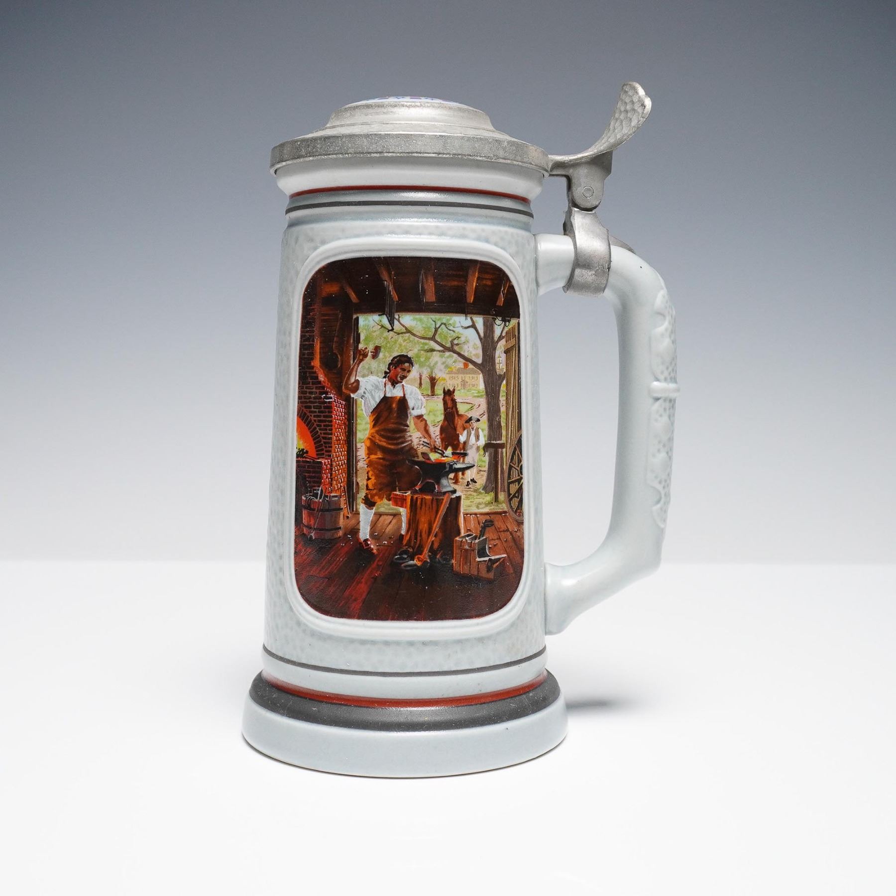 From The Building of America Stein Collection, this 1985 ceramic stein titled The Blacksmith was designed by artist Uldin Klavin and handcrafted in Brazil exclusively for Avon Products, Inc. The front displays a vibrant scene of a village blacksmith at work inside his forge, while the reverse features a hanging wooden-style sign labeled Village Blacksmith. The stein is topped with a pewter lid inset with a patriotic enamel crest showcasing tools of the trade surrounded by stars and stripes. Serial number 166572 printed on the base.