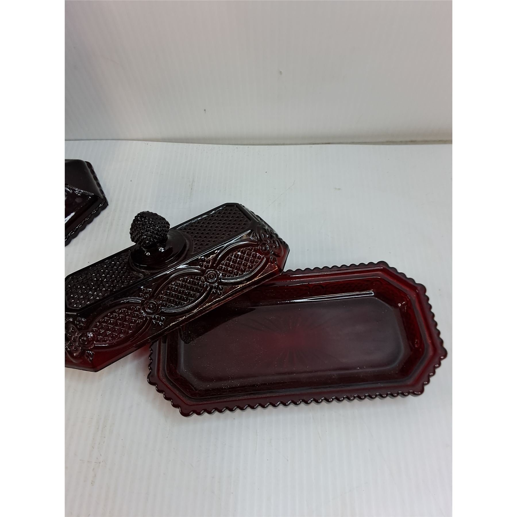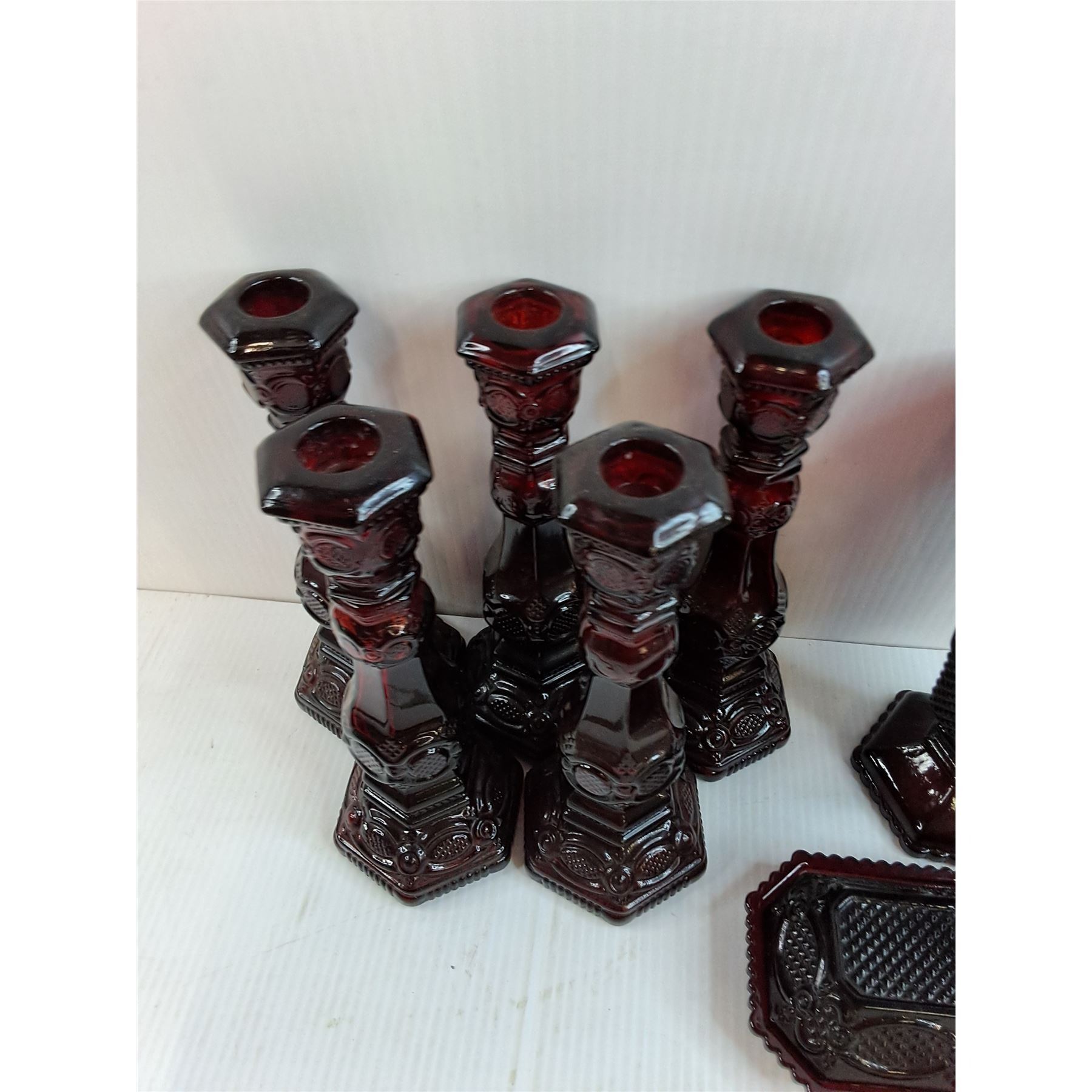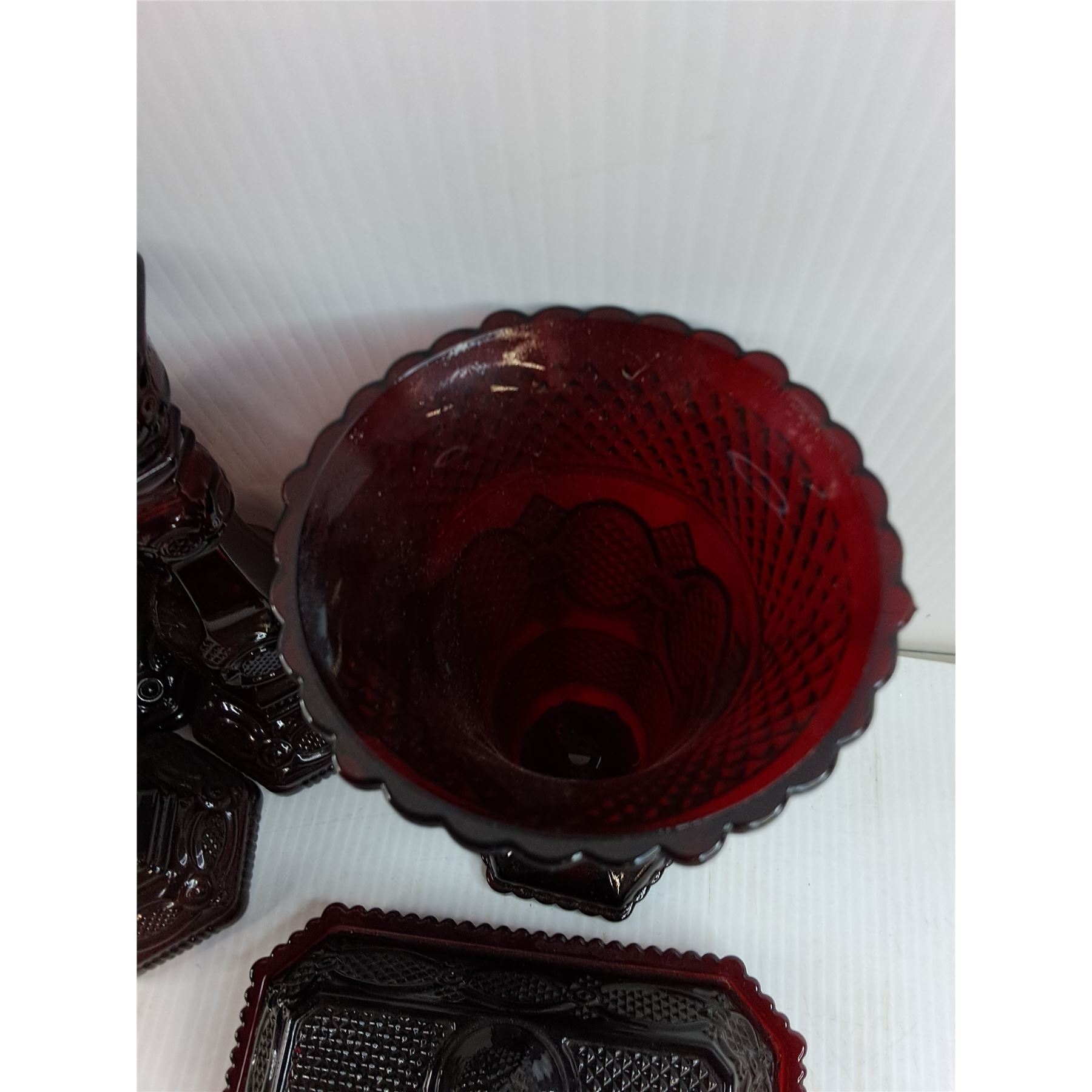 Avon Vintage Ruby Red GlassVase, (5) Candle Holders With Compartments, Butter Dish