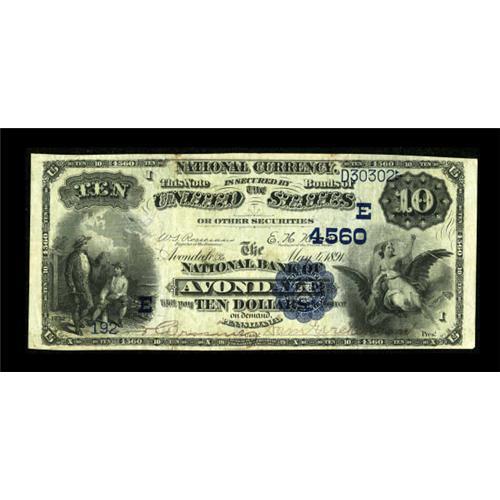 <B>Avondale, PA</B></I> - $10 1882 Date Back Fr. 540 <B>The NB of Avondale</B></I> Ch. # (E)4560<BR> Just five large notes are known from this Chester County bank, the sole issuer in Avondale. This is the only early note known, and is the finest note in the census from this bank as well. Track and Price lists only one large example of any kind sold from here in the past dozen years, making this better Chester County example even more desirable. Nice <B>Very Fine.</B></I><BR><BR><b>Shipping:</b> Coins & Currency (<a target="_blank" href="http://www.heritageauctions.com/common/shipping.php">view shipping information</a>)